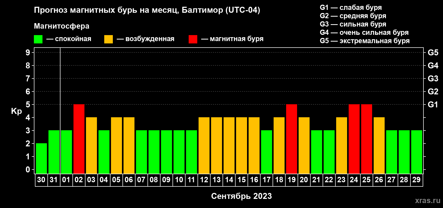 Прогноз магнитных бурь в Балтиморе на 30 августа 2023 года