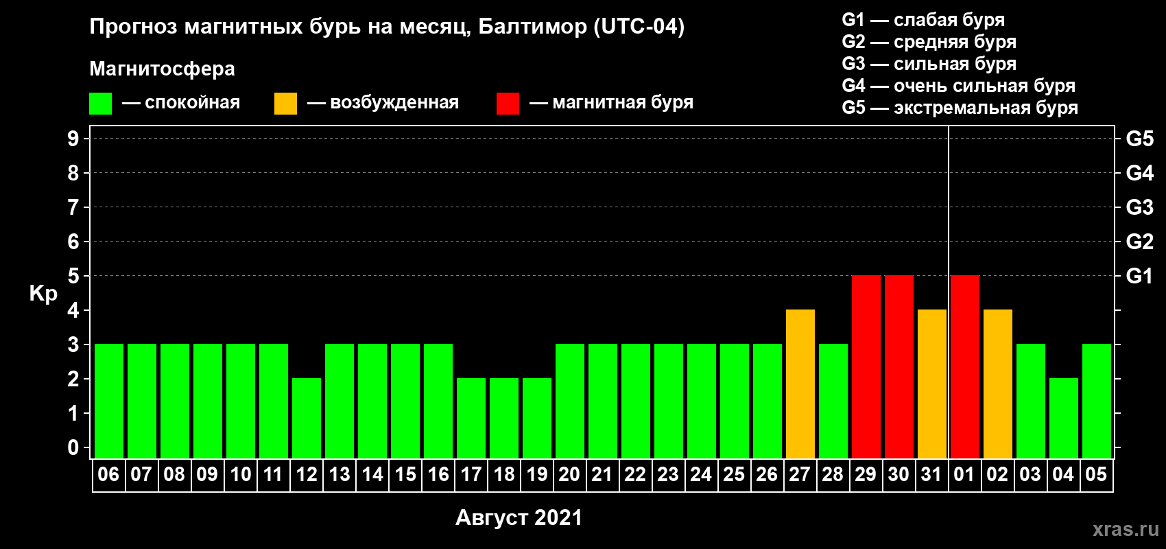 Прогноз магнитных бурь в Балтиморе на 6 августа 2021 года