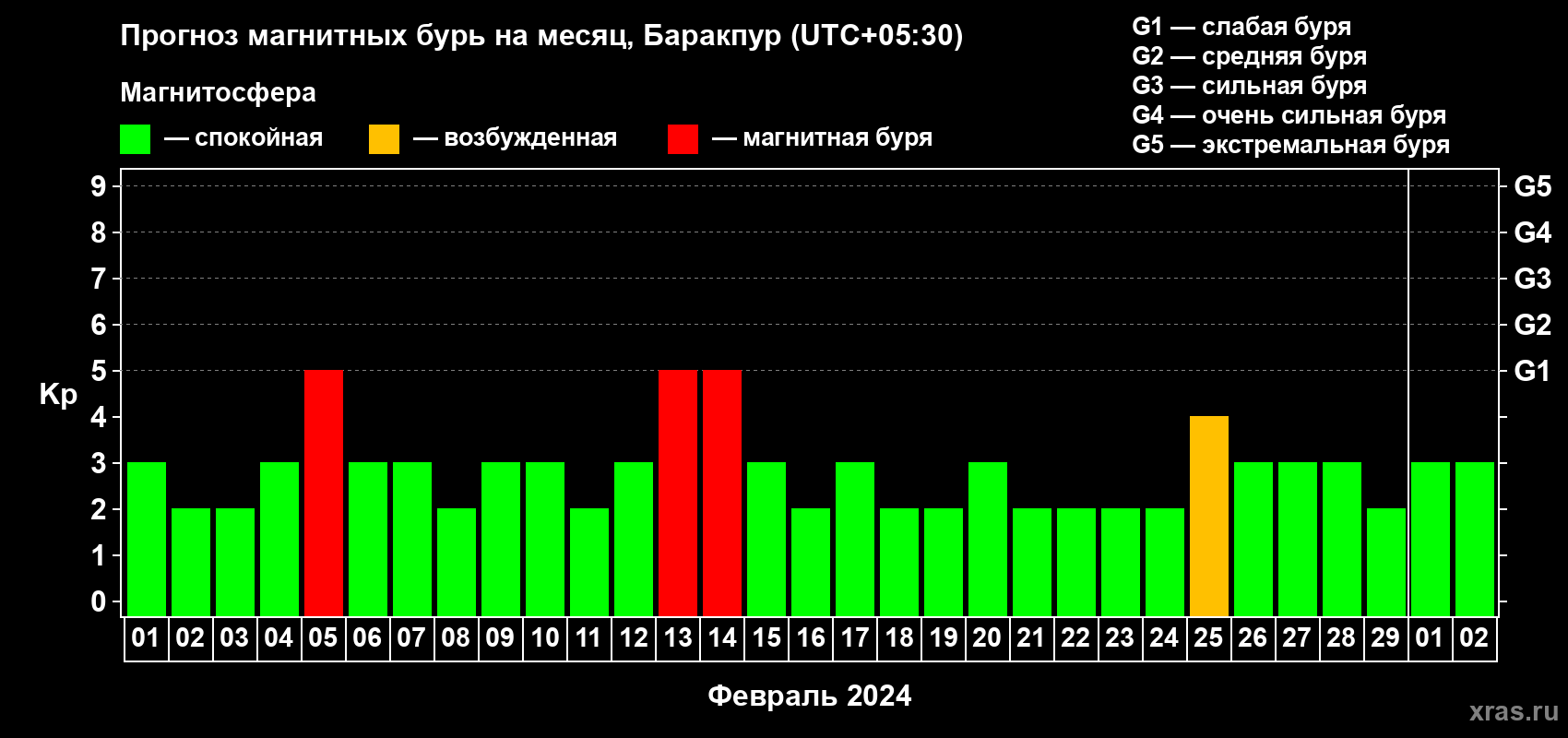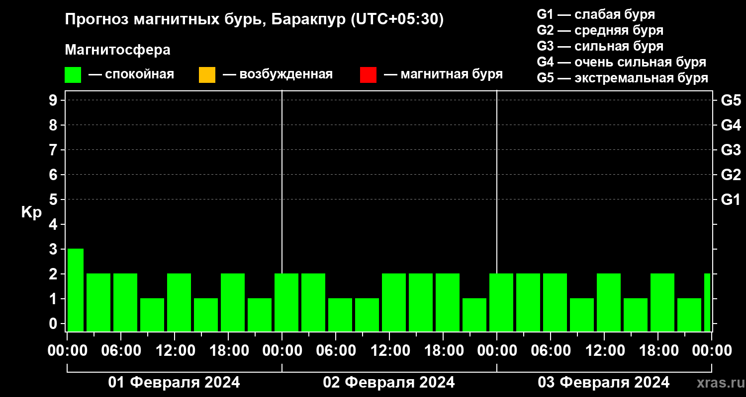 Прогноз магнитных бурь в Баракпуре на 1 февраля 2024 года