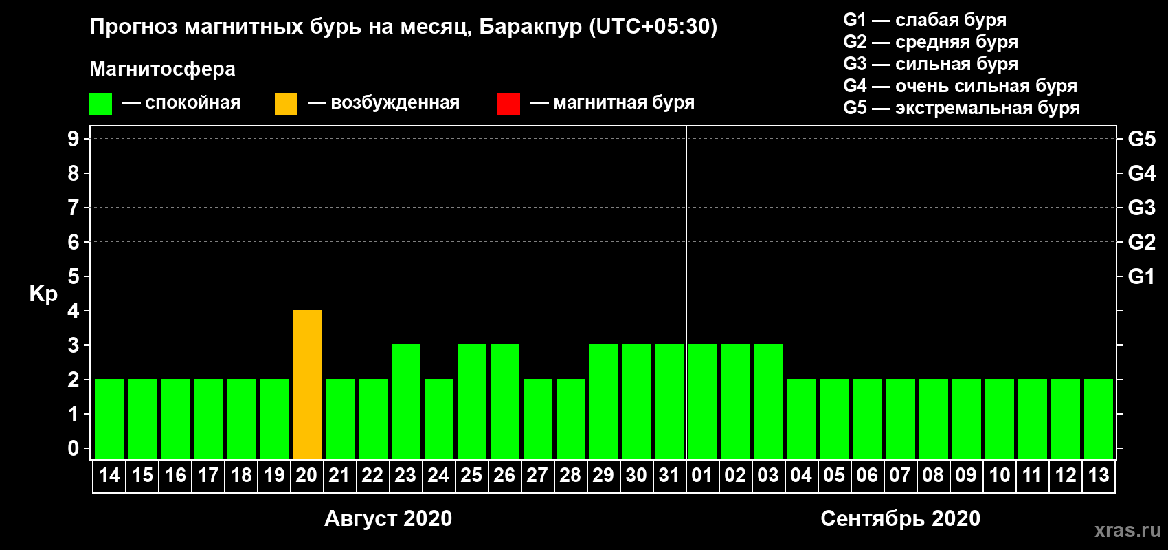 Прогноз магнитных бурь в Баракпуре — 14 августа 2020 года