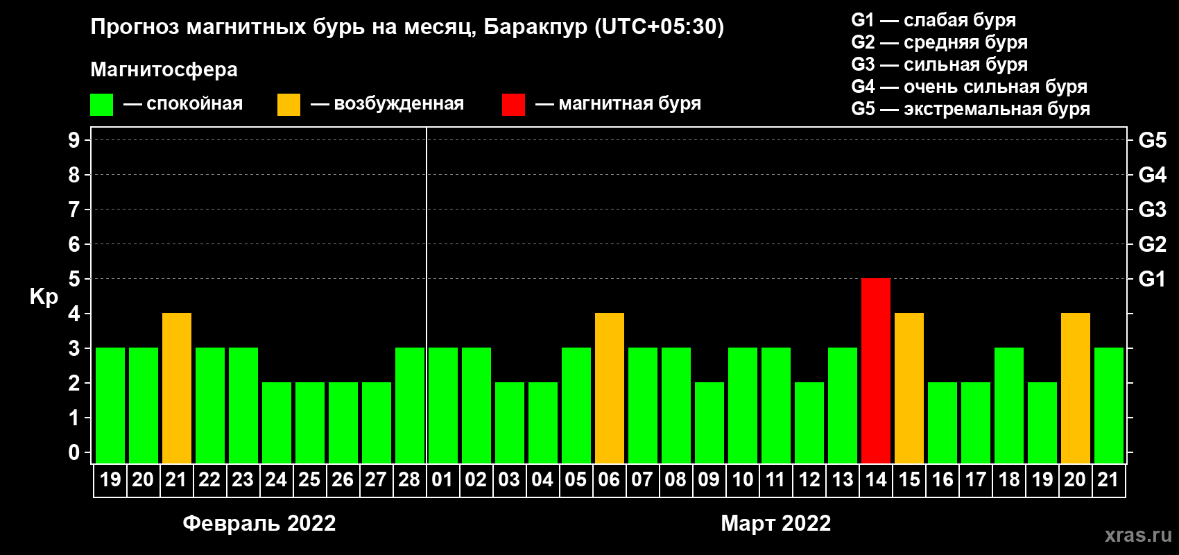 Прогноз магнитных бурь в Баракпуре — 19 февраля 2022 года