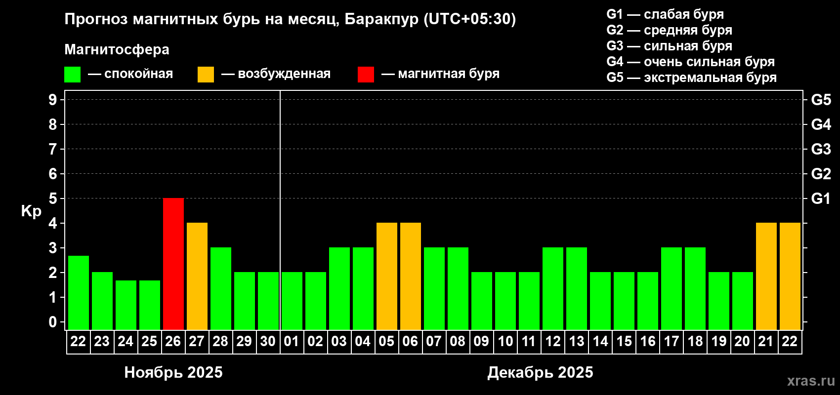 Прогноз магнитных бурь в Баракпуре — 22 ноября 2025 года