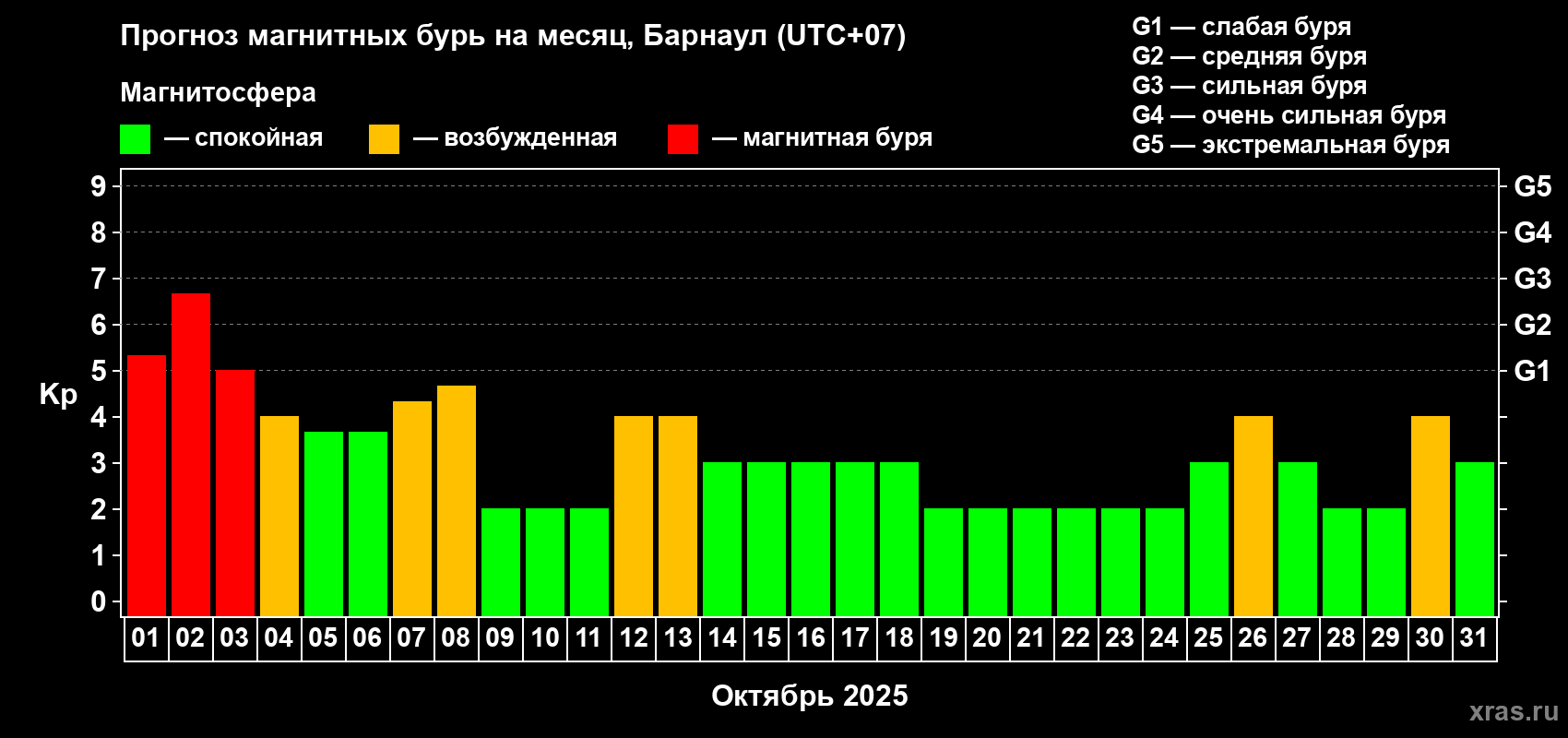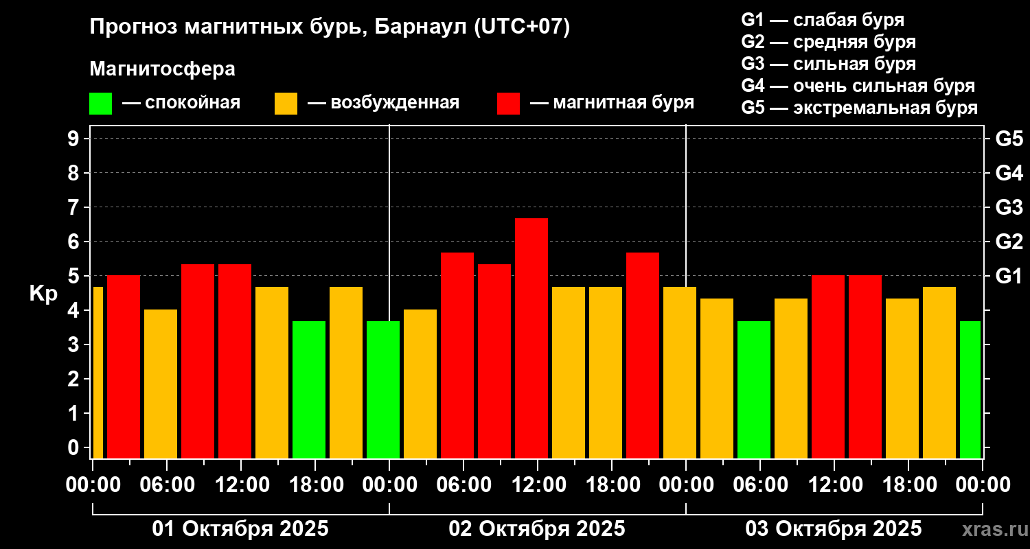 Прогноз магнитных бурь в Барнауле на 1 октября 2025 года