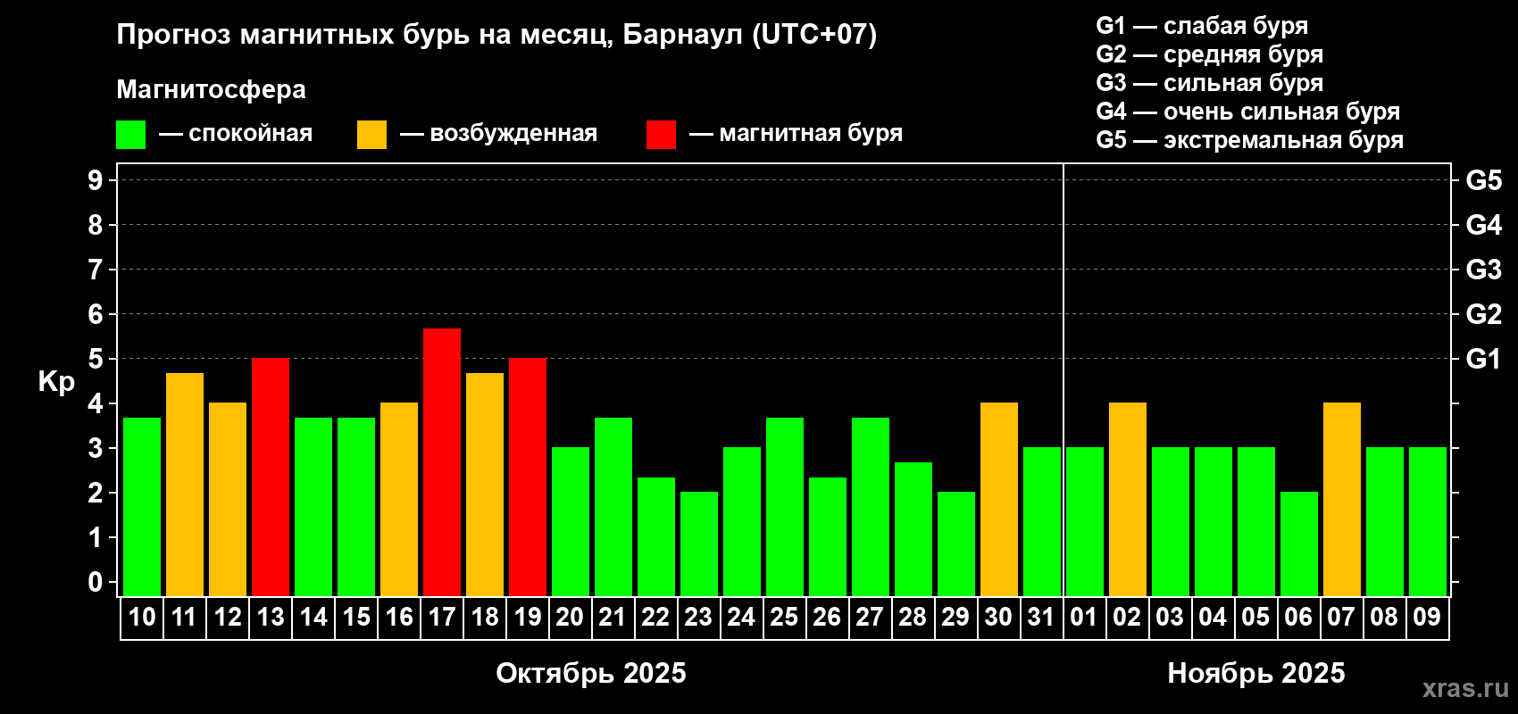 Прогноз магнитных бурь в Барнауле — 10 октября 2025 года