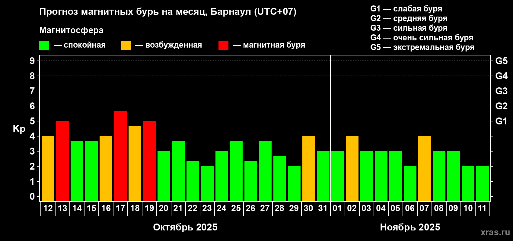 Прогноз магнитных бурь в Барнауле — 12 октября 2025 года