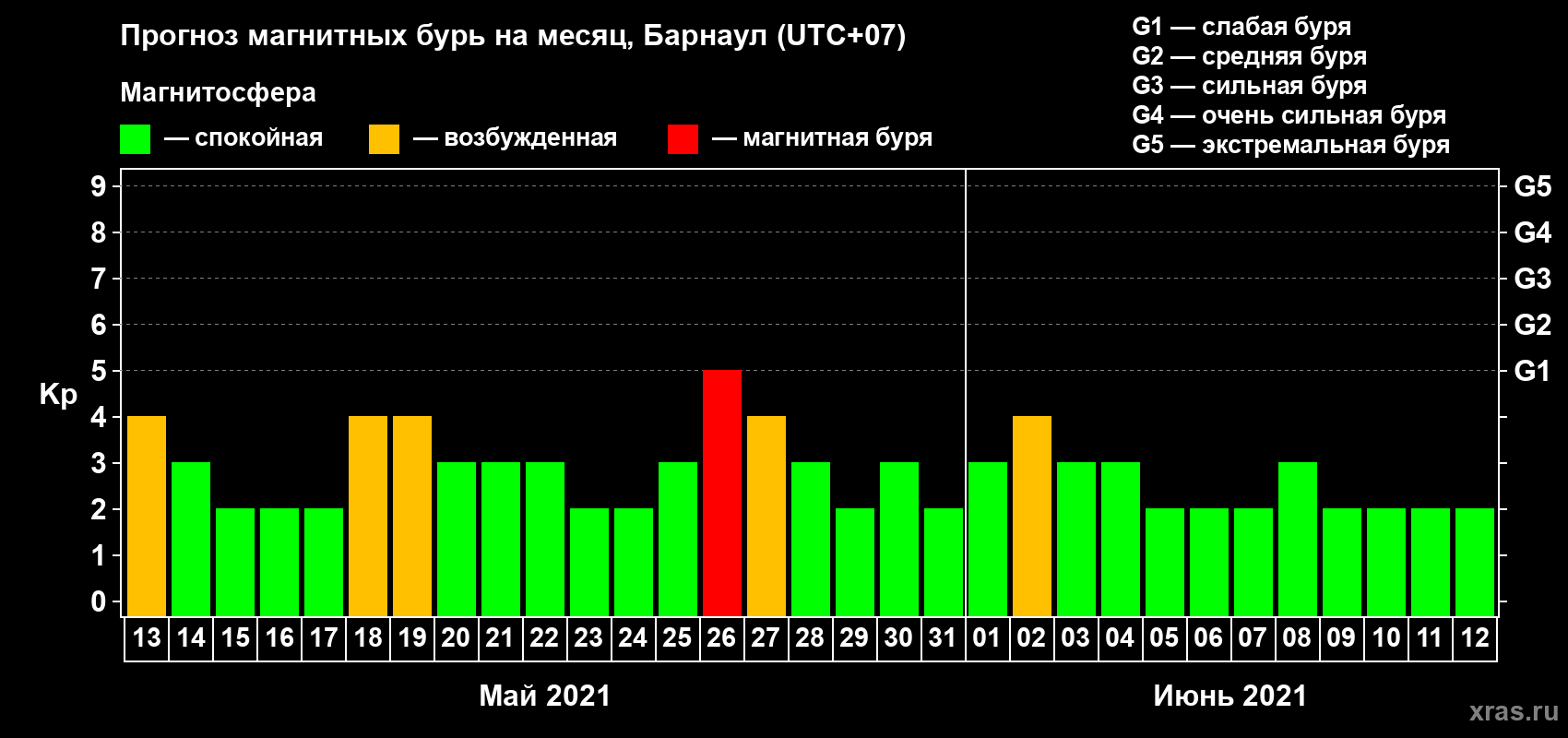 Прогноз магнитных бурь в Барнауле на 13 мая 2021 года