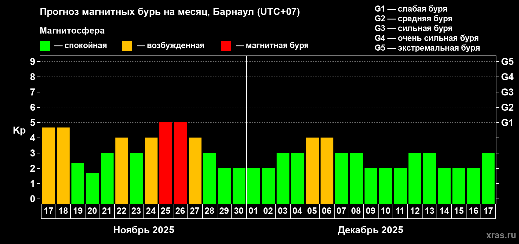 Прогноз магнитных бурь в Барнауле — 17 ноября 2025 года
