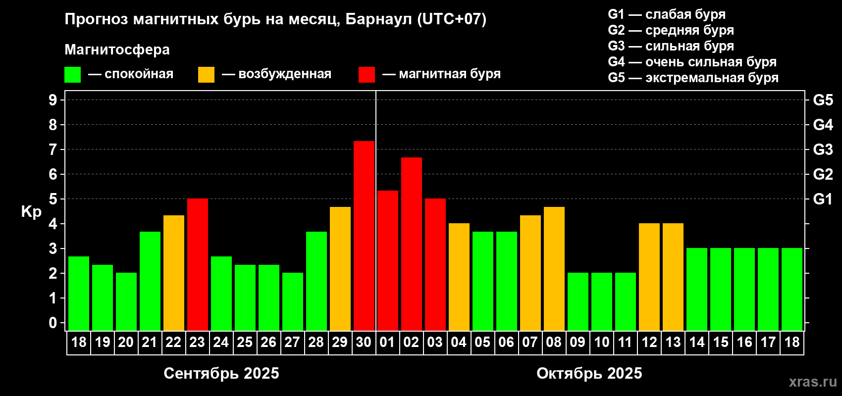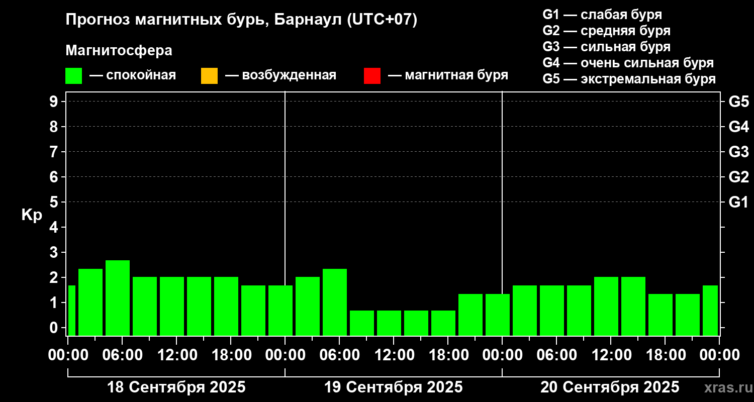 Прогноз магнитных бурь в Барнауле на 18 сентября 2025 года