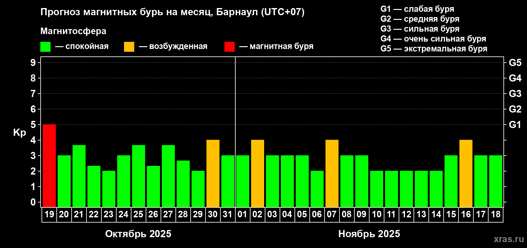 Прогноз магнитных бурь в Барнауле — 19 октября 2025 года