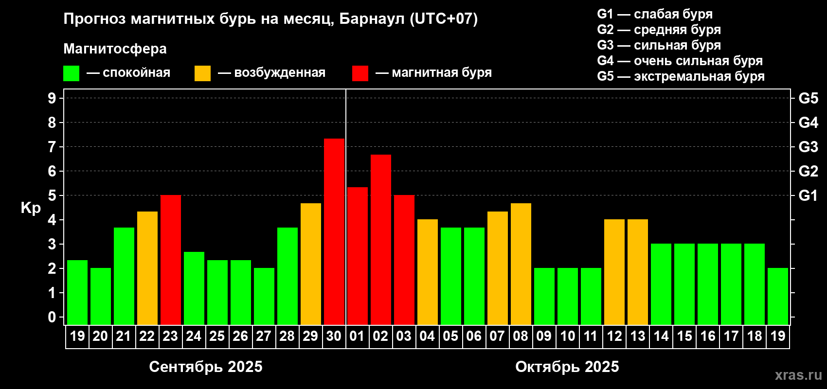 Прогноз магнитных бурь в Барнауле на 19 сентября 2025 года