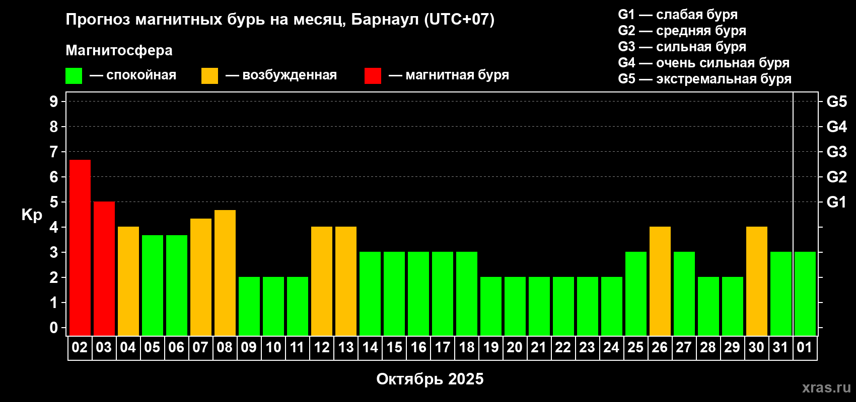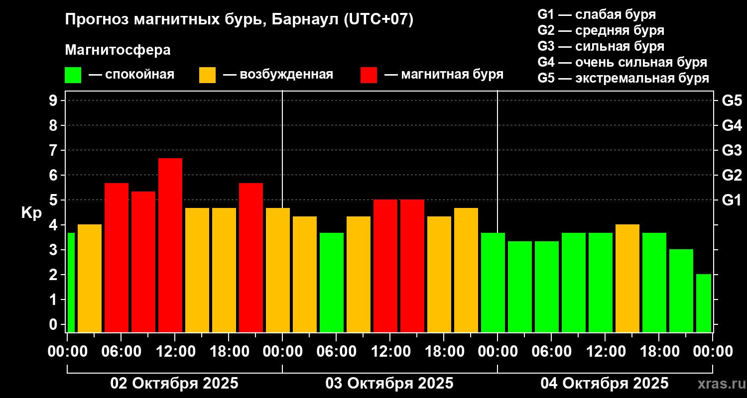 Прогноз магнитных бурь в Барнауле — 2 октября 2025 года