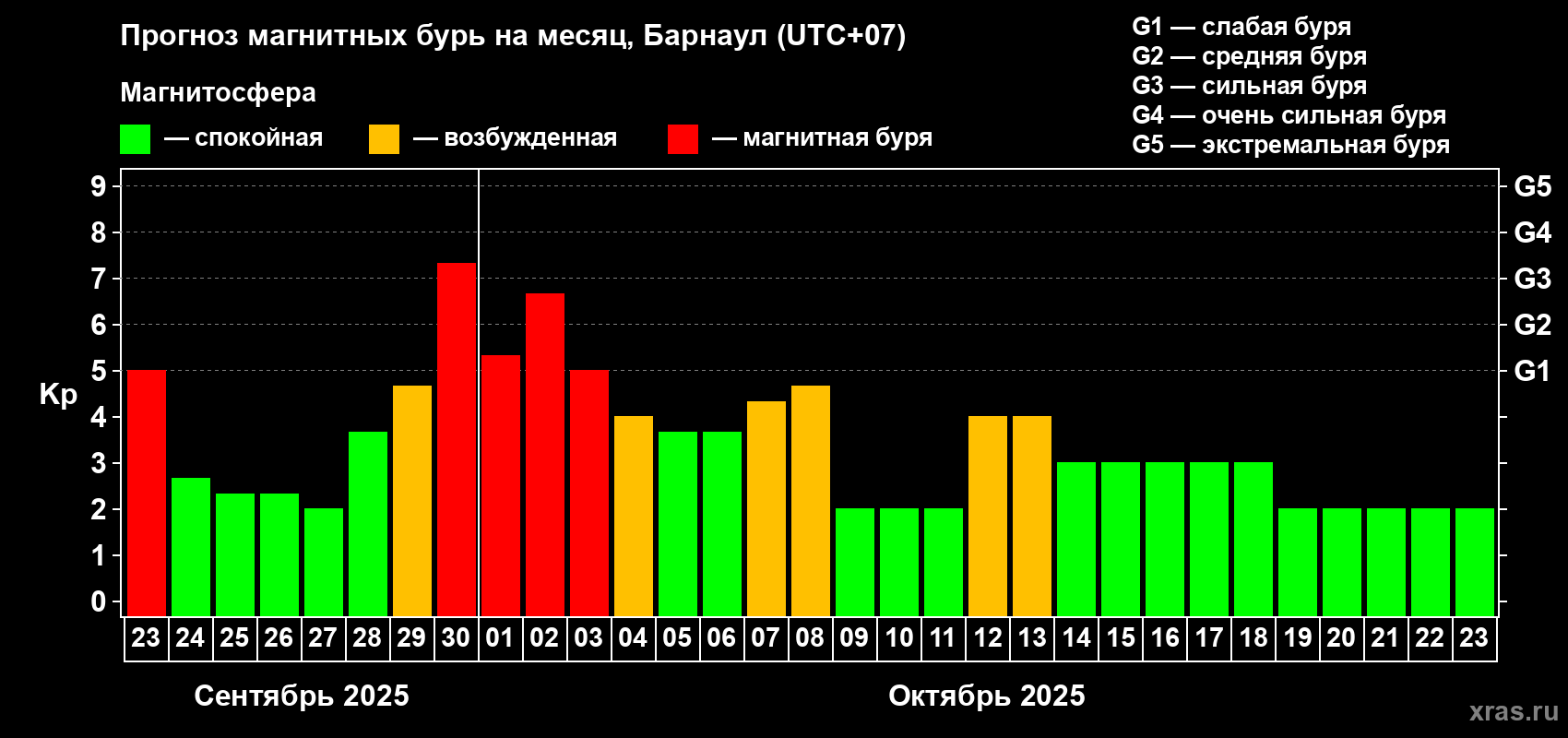 Прогноз магнитных бурь в Барнауле на 23 сентября 2025 года