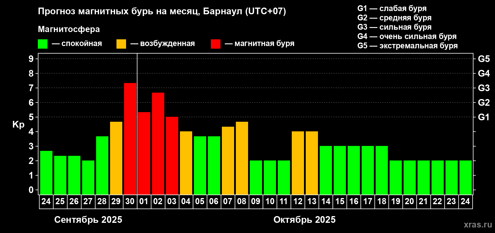 Прогноз магнитных бурь в Барнауле — 24 сентября 2025 года