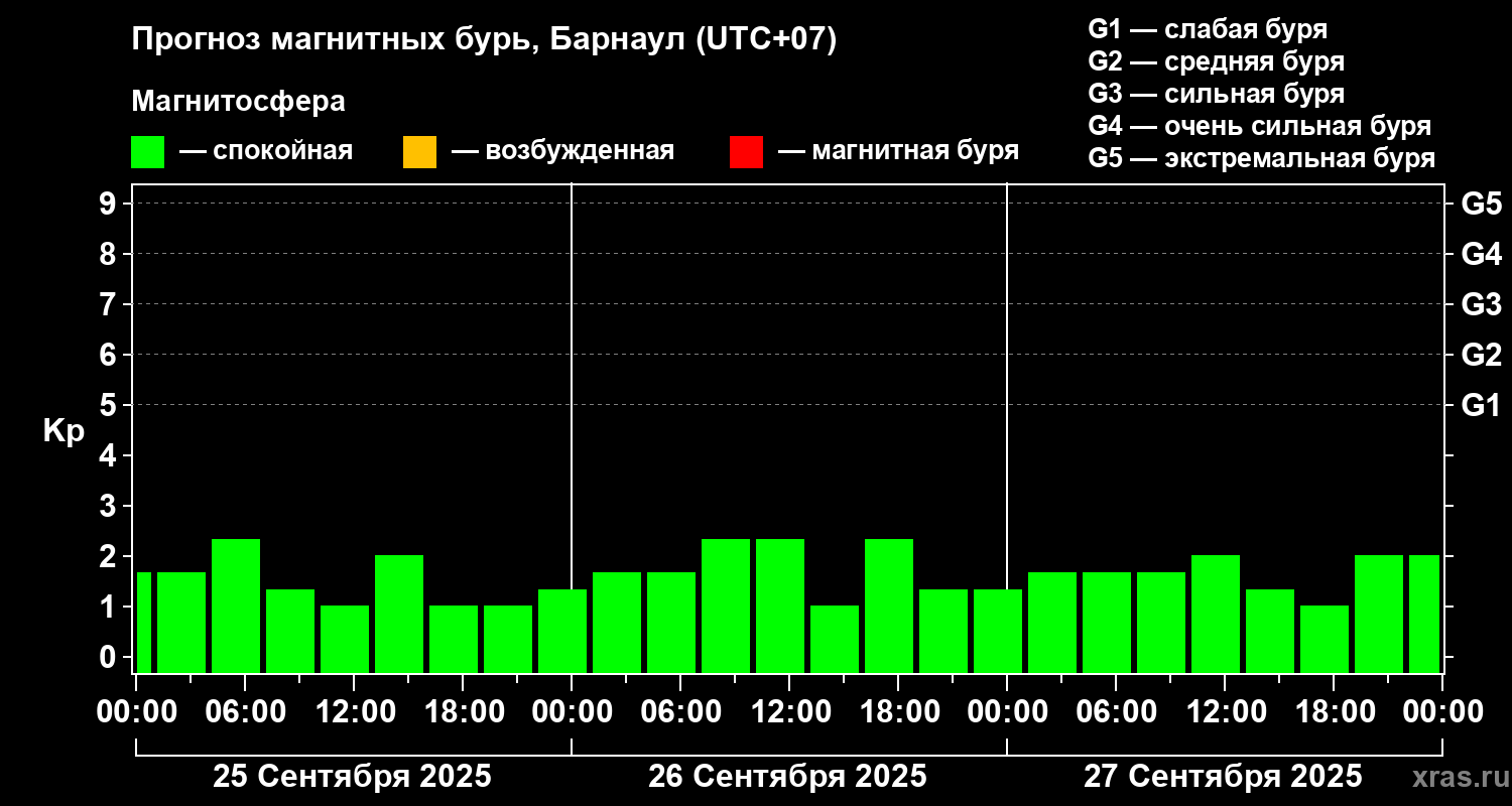 Прогноз магнитных бурь в Барнауле на 25 сентября 2025 года