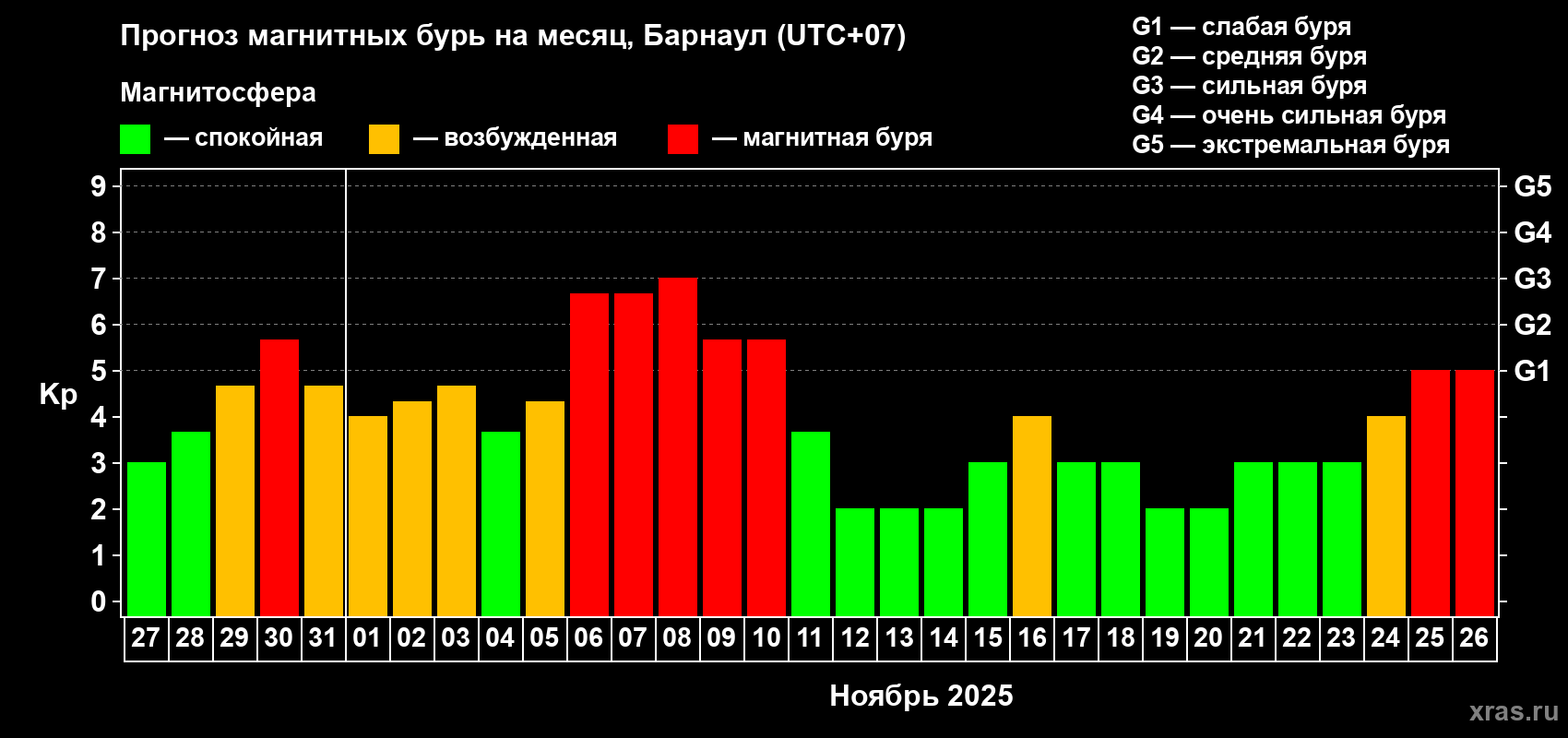 Прогноз магнитных бурь в Барнауле — 27 октября 2025 года