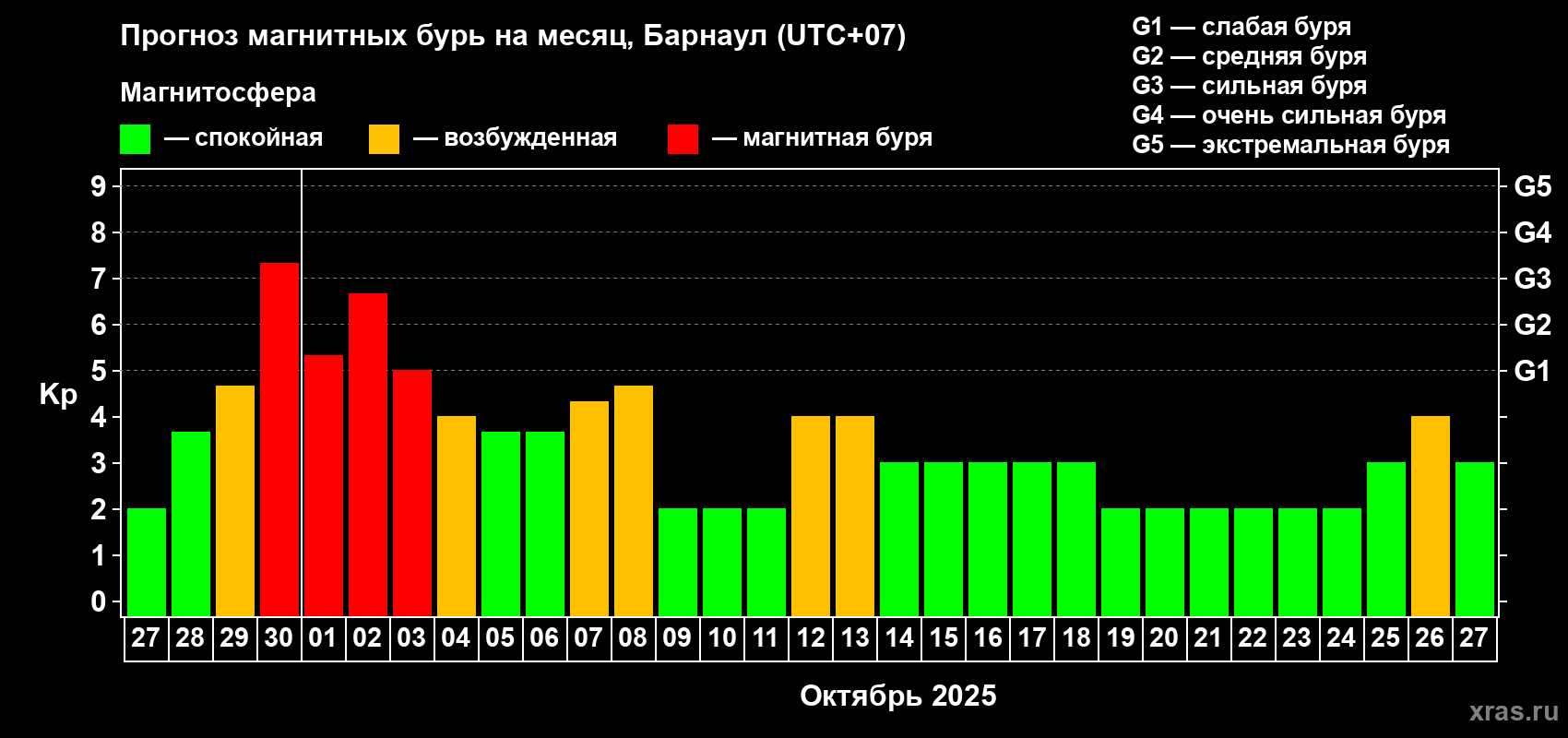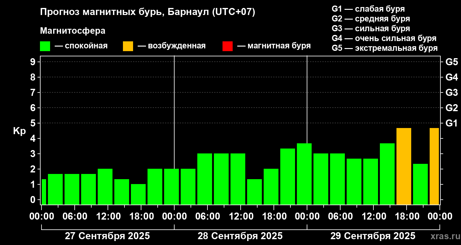 Прогноз магнитных бурь в Барнауле на 27 сентября 2025 года