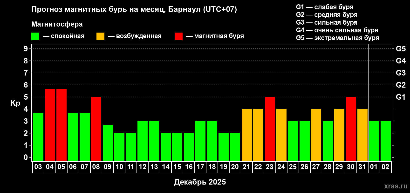 Прогноз магнитных бурь в Барнауле — 3 декабря 2025 года