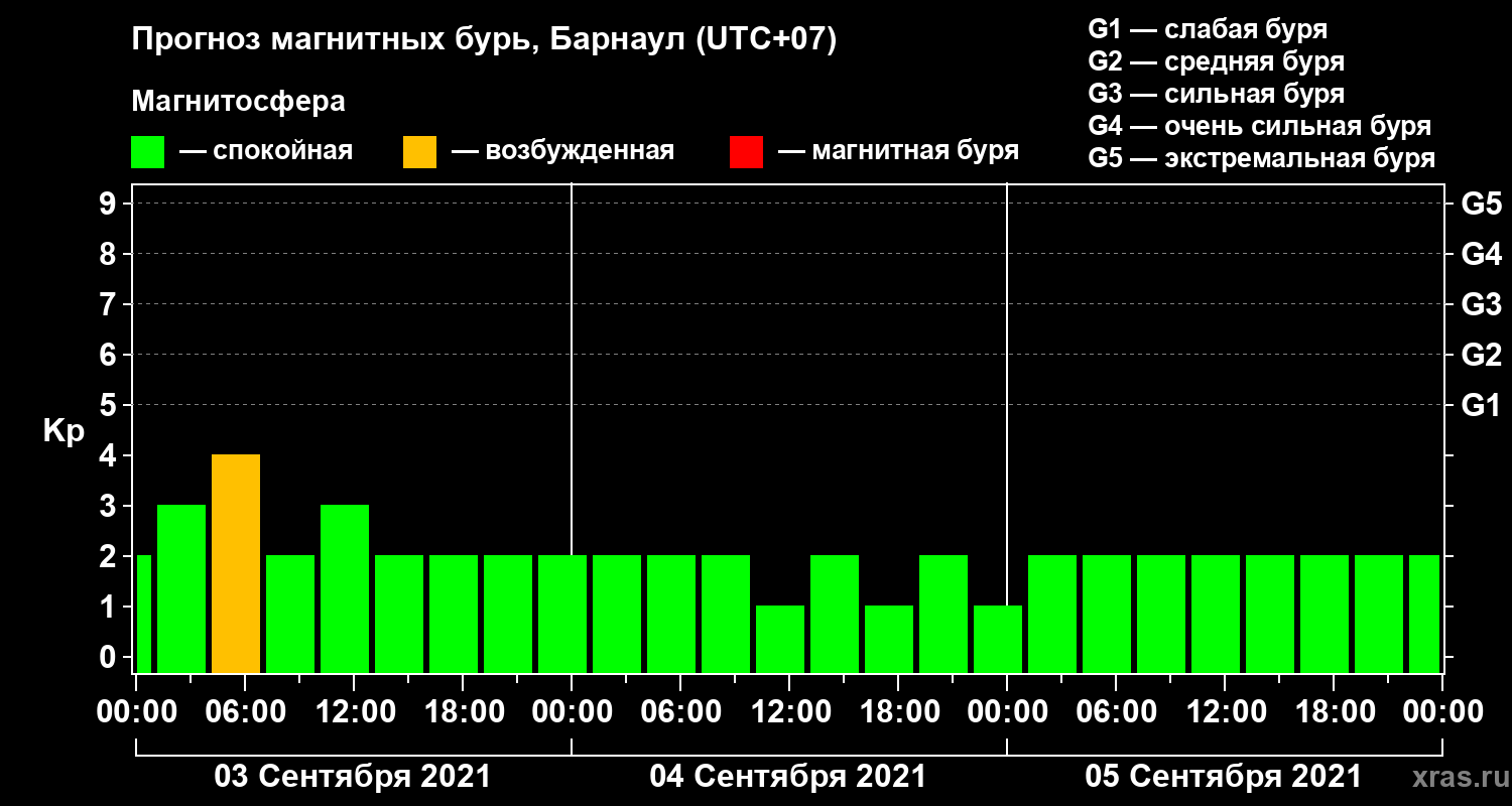 Прогноз магнитных бурь в Барнауле на 3 сентября 2021 года