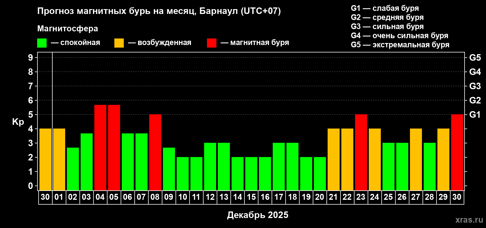 Прогноз магнитных бурь в Барнауле на 30 ноября 2025 года
