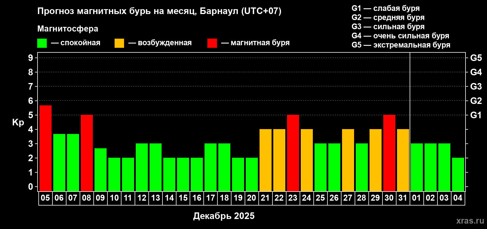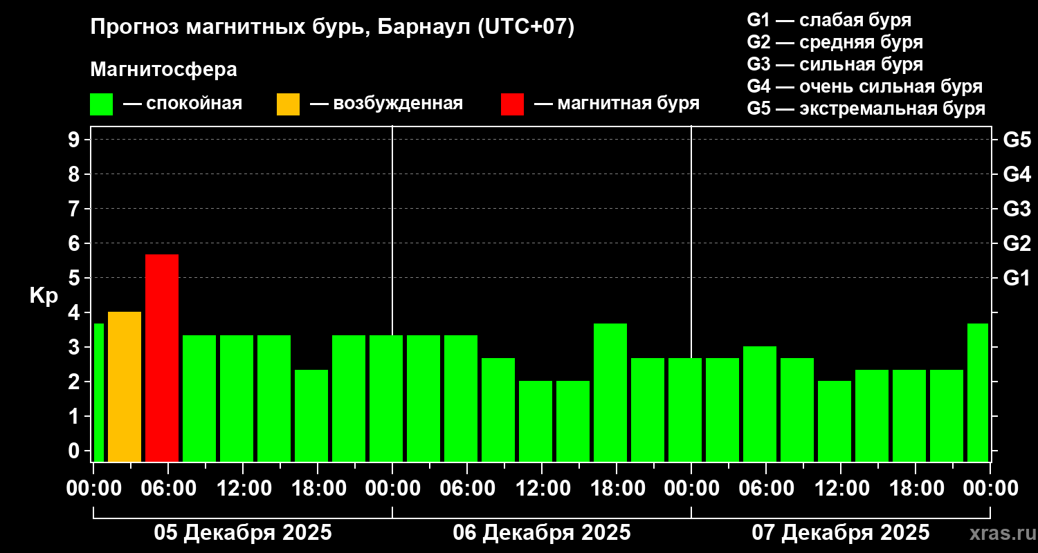 Прогноз магнитных бурь в Барнауле — 5 декабря 2025 года