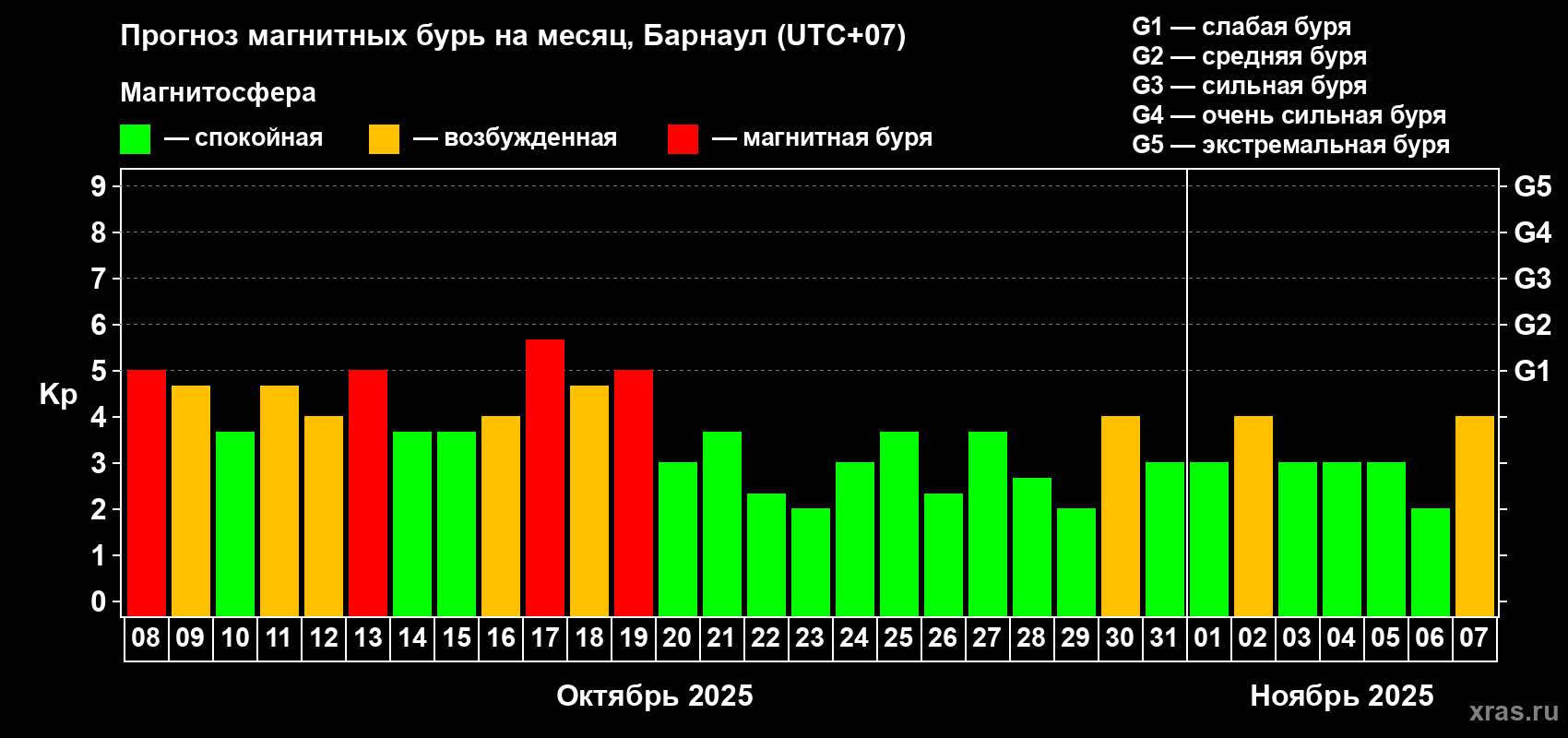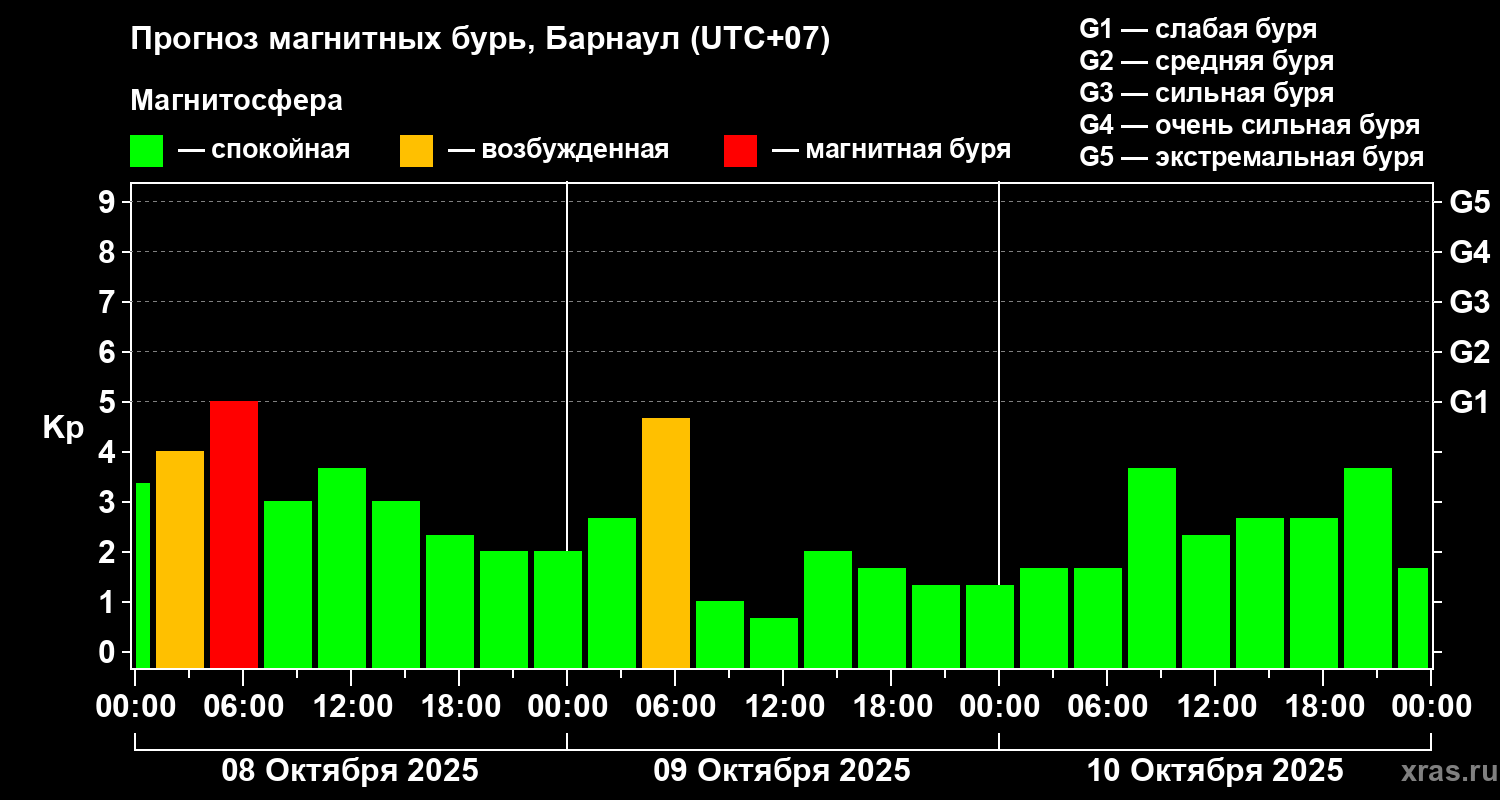 Прогноз магнитных бурь в Барнауле на 8 октября 2025 года