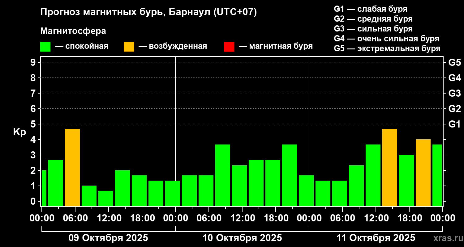 Прогноз магнитных бурь в Барнауле — 9 октября 2025 года