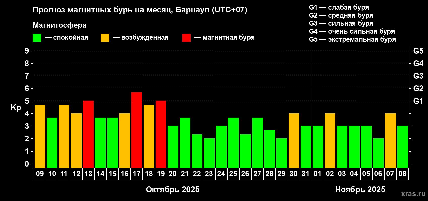 Прогноз магнитных бурь в Барнауле на 9 октября 2025 года