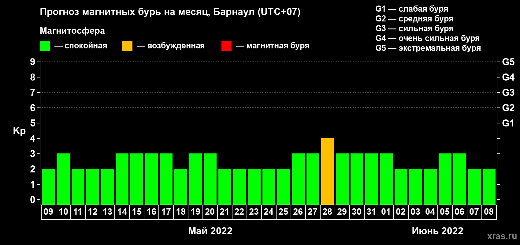 Прогноз магнитных бурь в Барнауле — 9 мая 2022 года