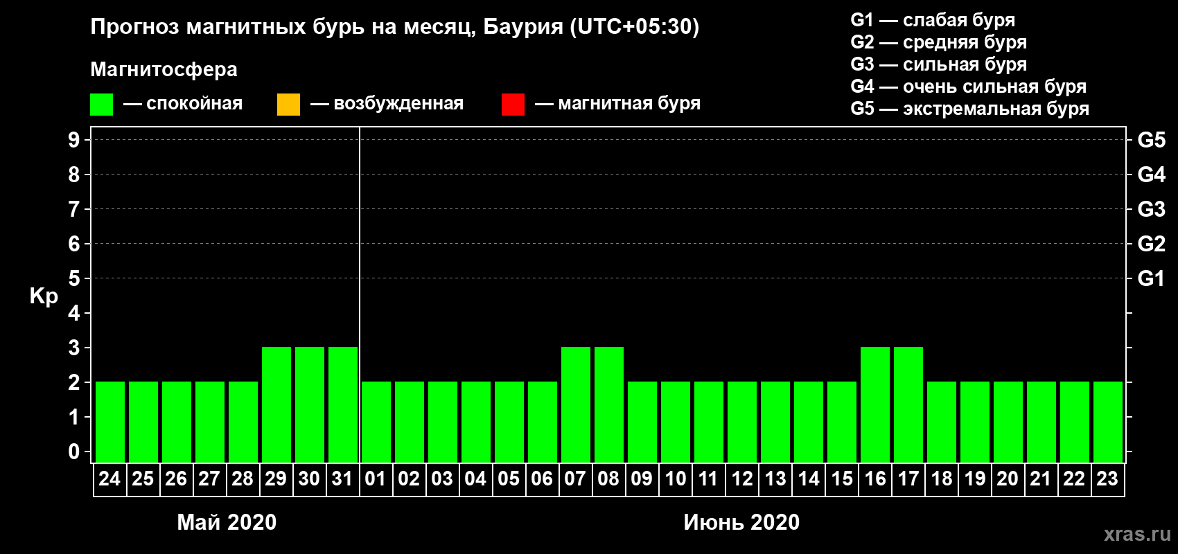 Прогноз магнитных бурь в Баурии на 24 мая 2020 года