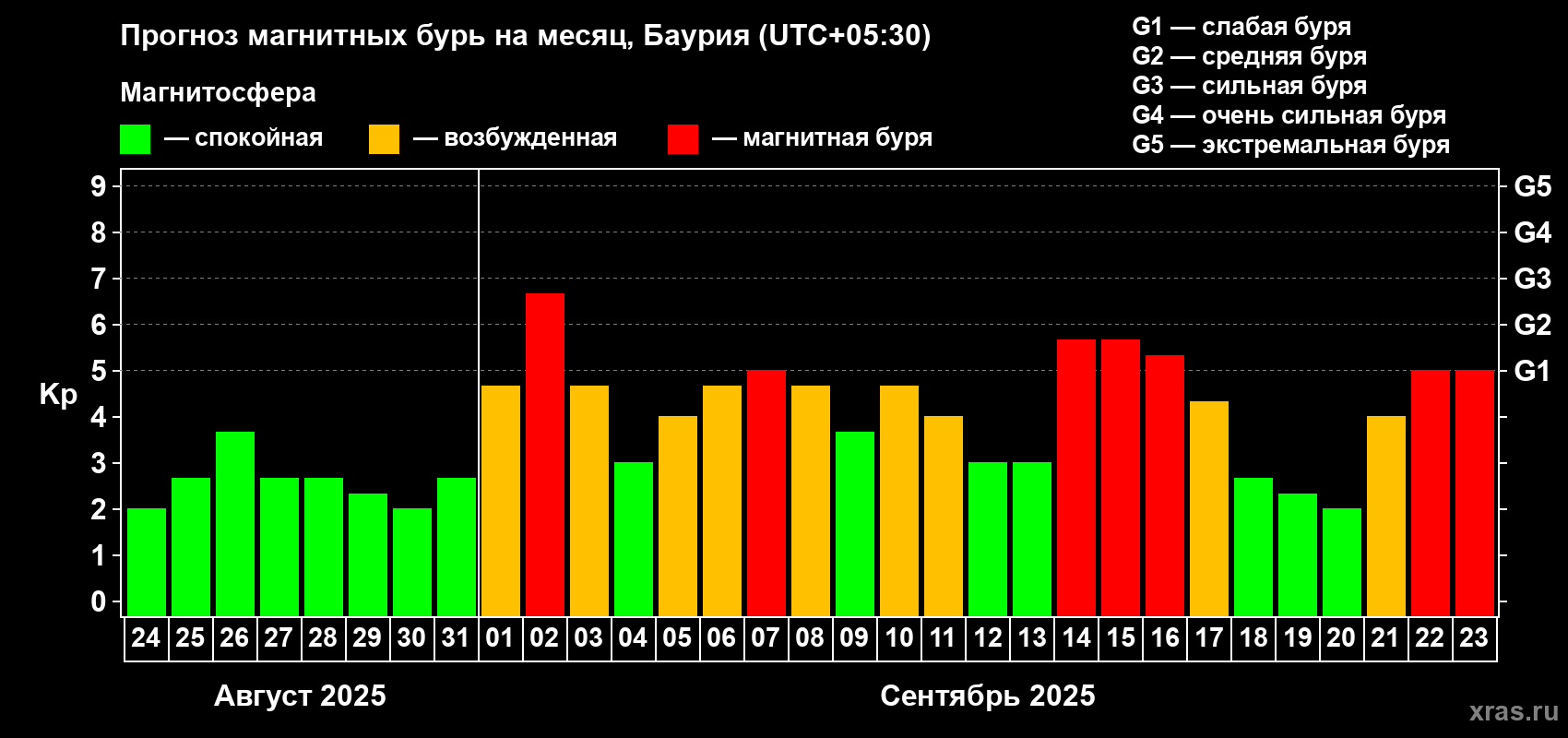 Прогноз магнитных бурь в Баурии — 24 августа 2025 года