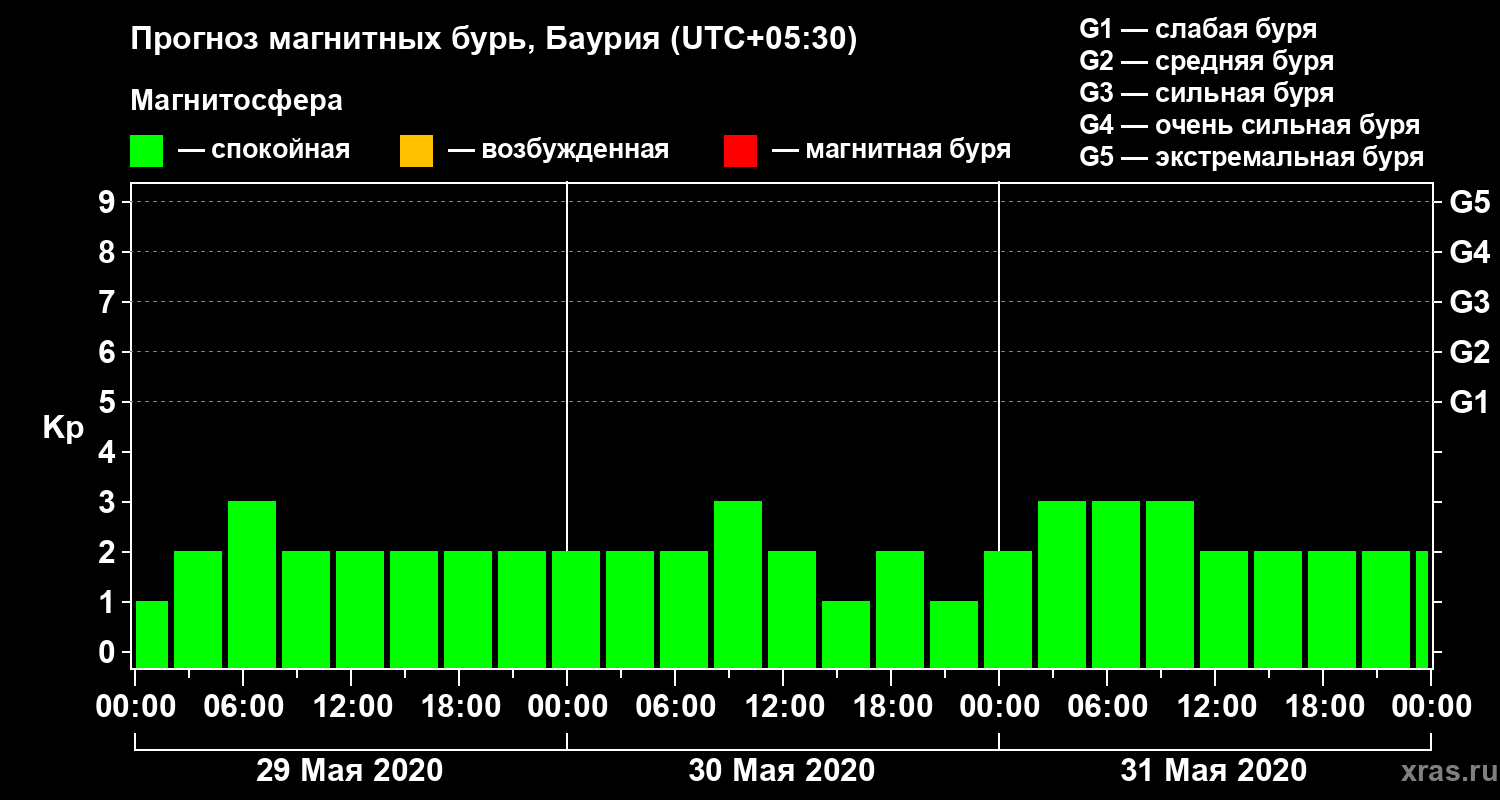 Прогноз магнитных бурь в Баурии на 29 мая 2020 года