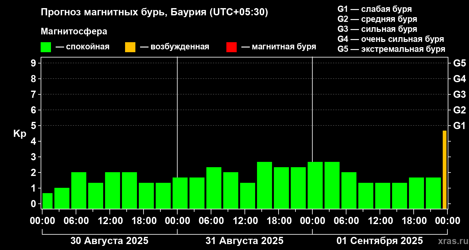 Прогноз магнитных бурь в Баурии — 30 августа 2025 года