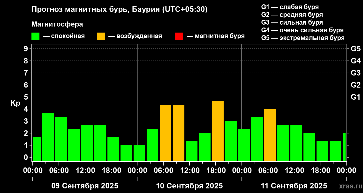 Прогноз магнитных бурь в Баурии на 9 сентября 2025 года