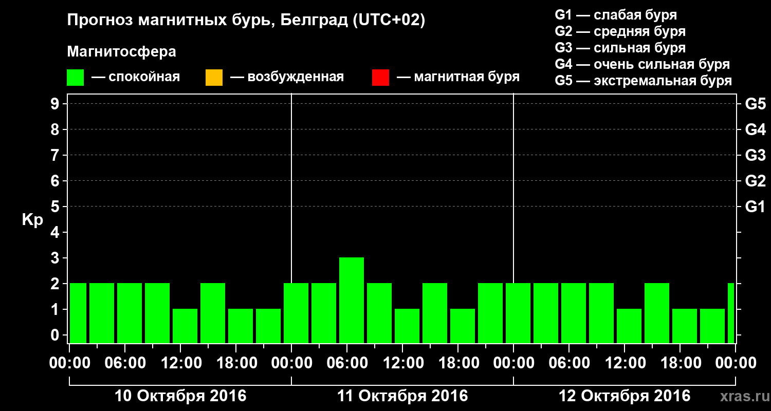 Прогноз магнитных бурь в Белграде — 10 октября 2016 года