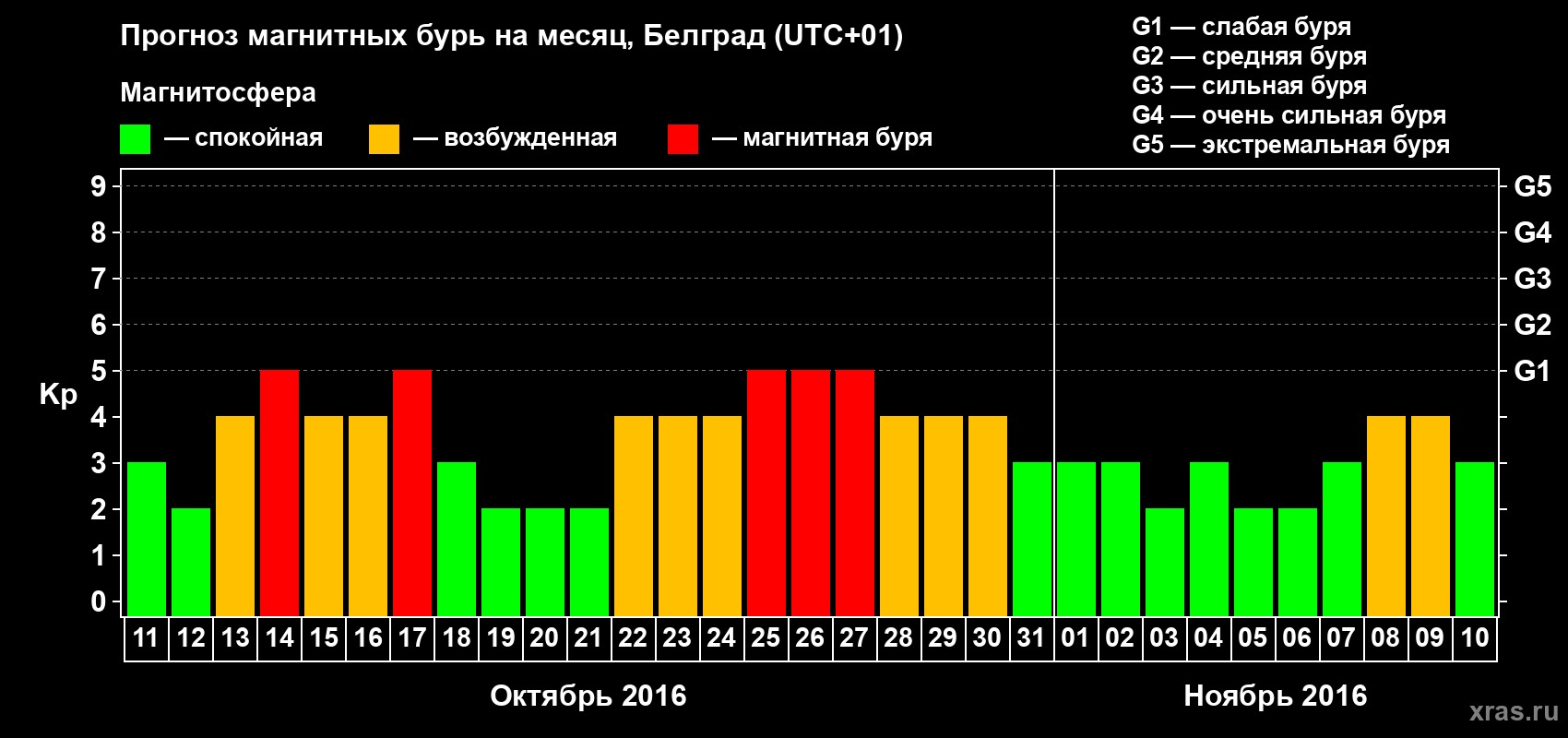 Прогноз магнитных бурь в Белграде — 11 октября 2016 года