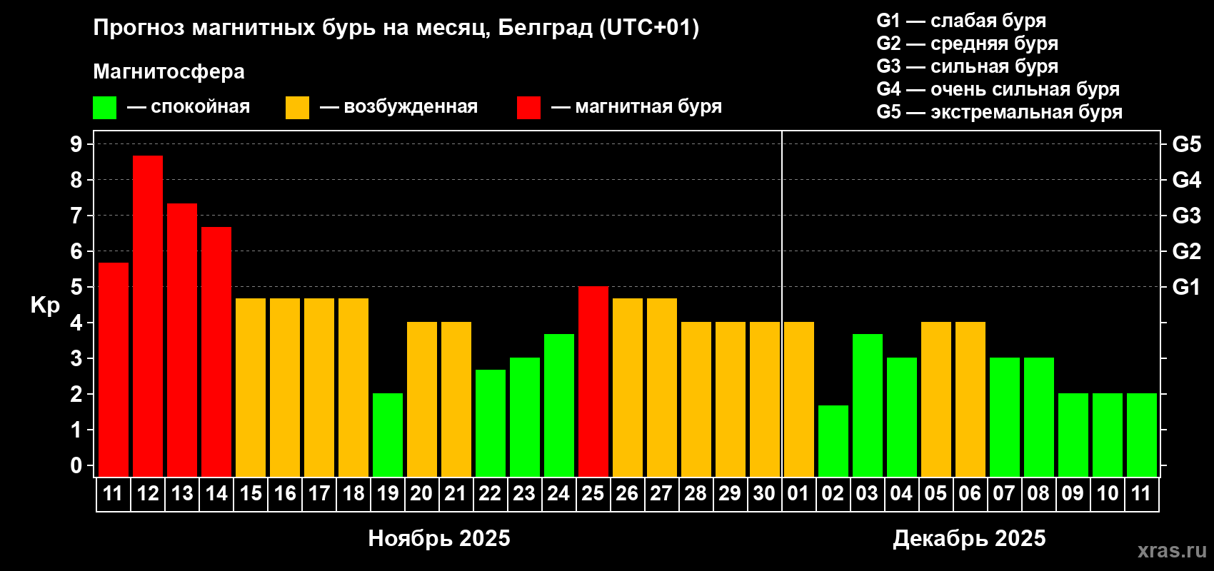 Прогноз магнитных бурь в Белграде — 11 ноября 2025 года
