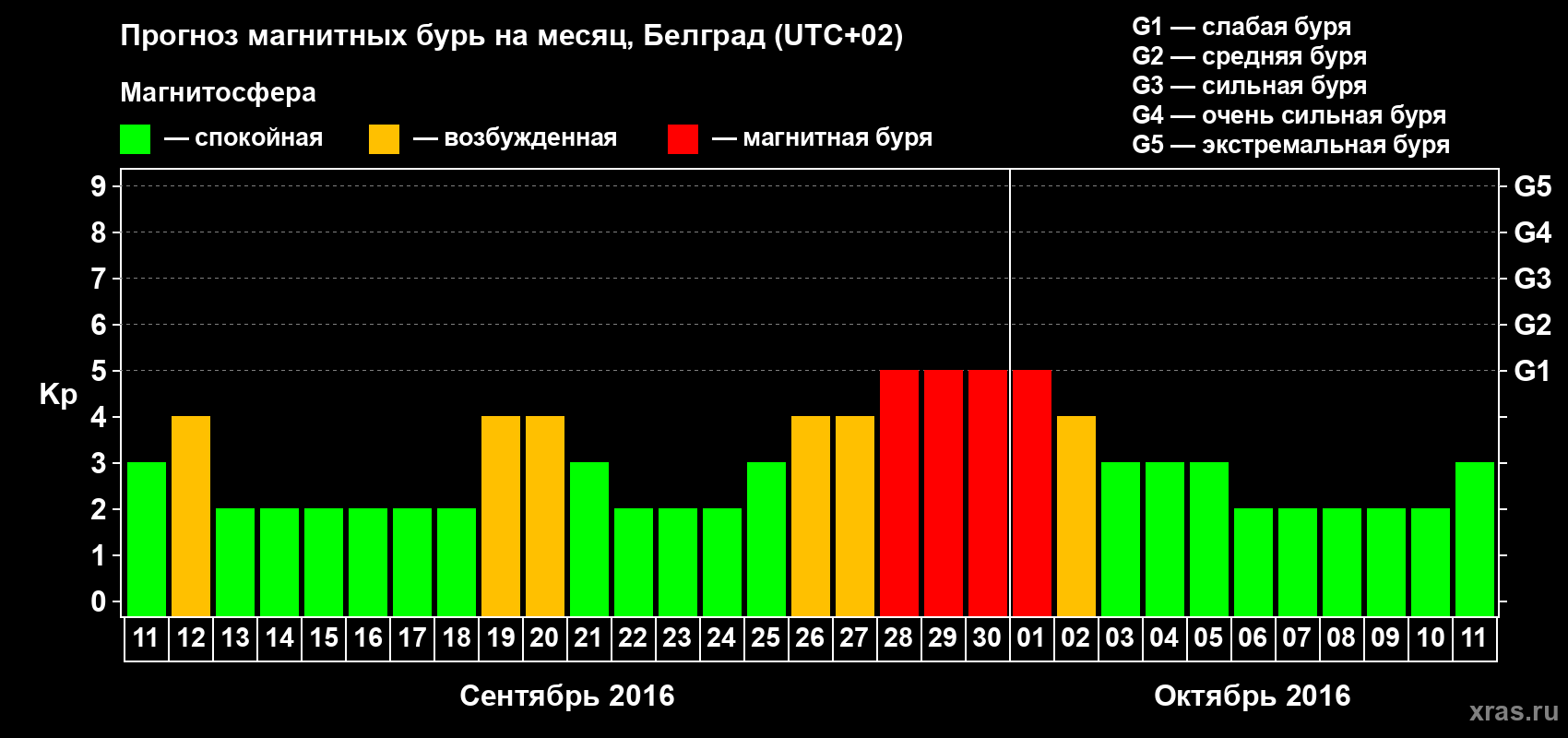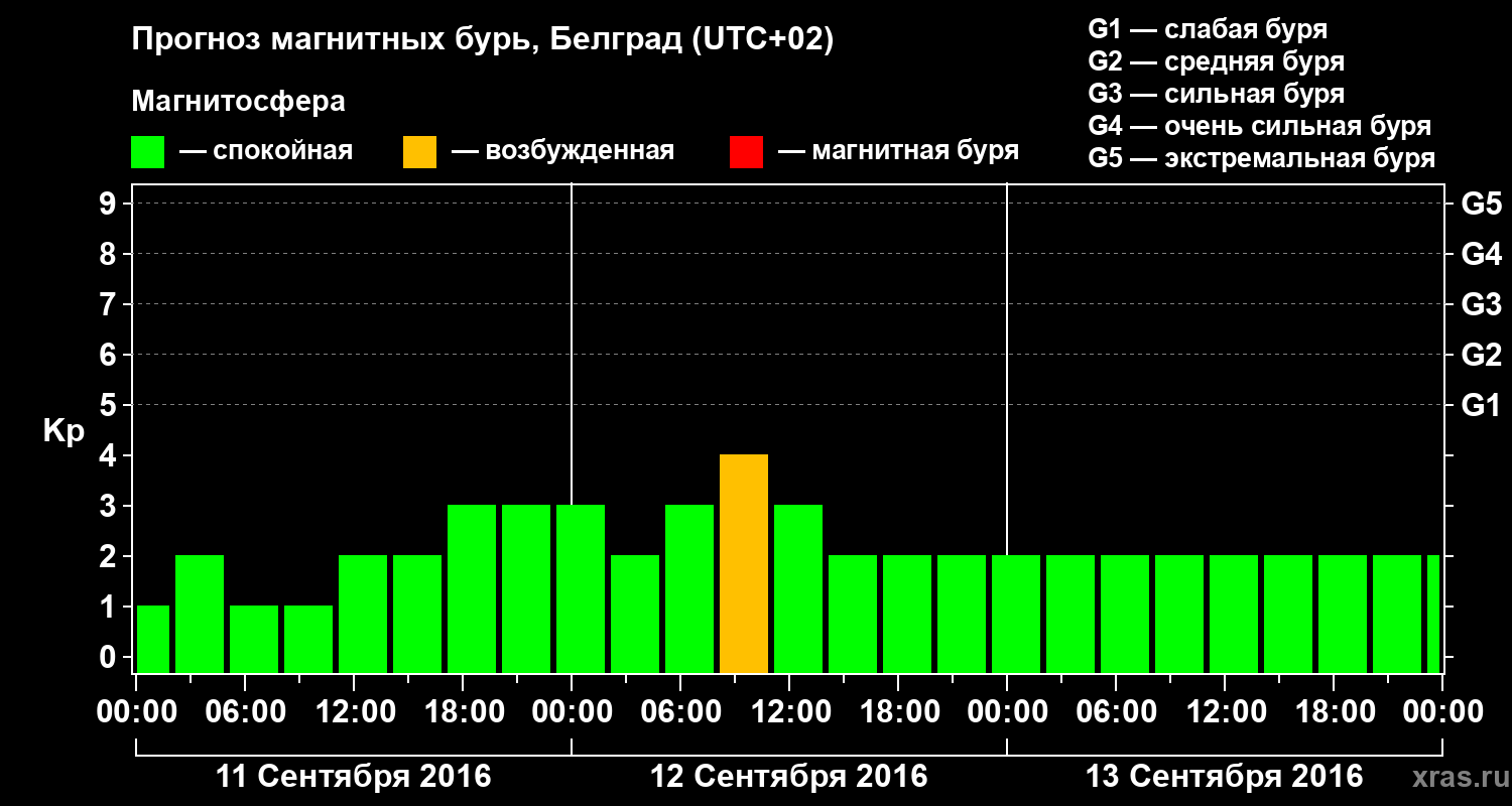 Прогноз магнитных бурь в Белграде — 11 сентября 2016 года