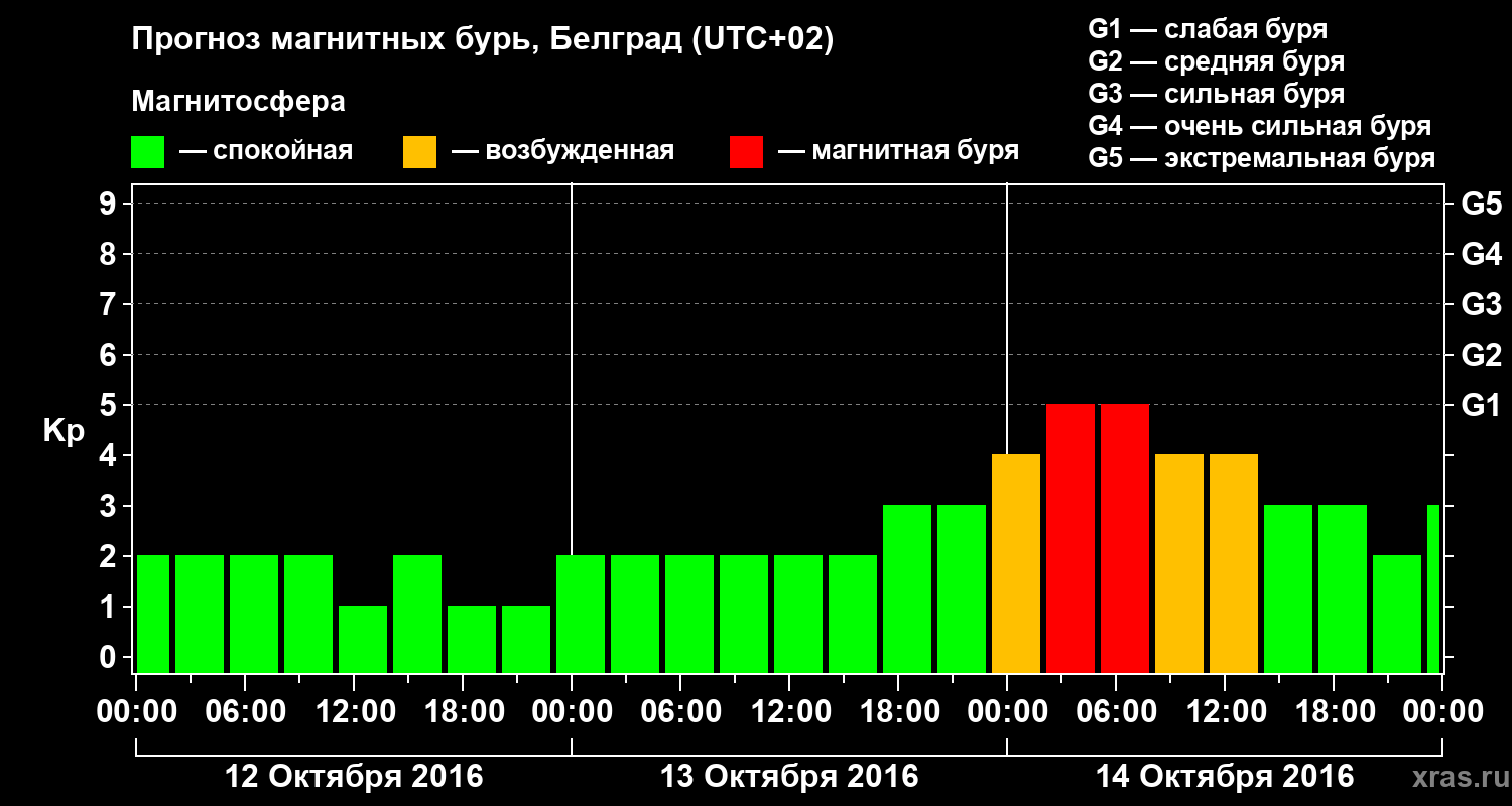 Прогноз магнитных бурь в Белграде — 12 октября 2016 года