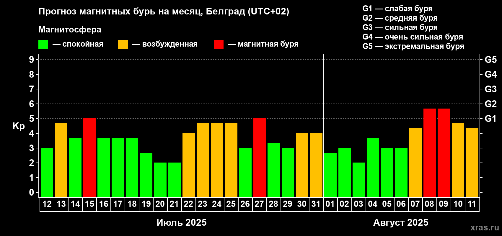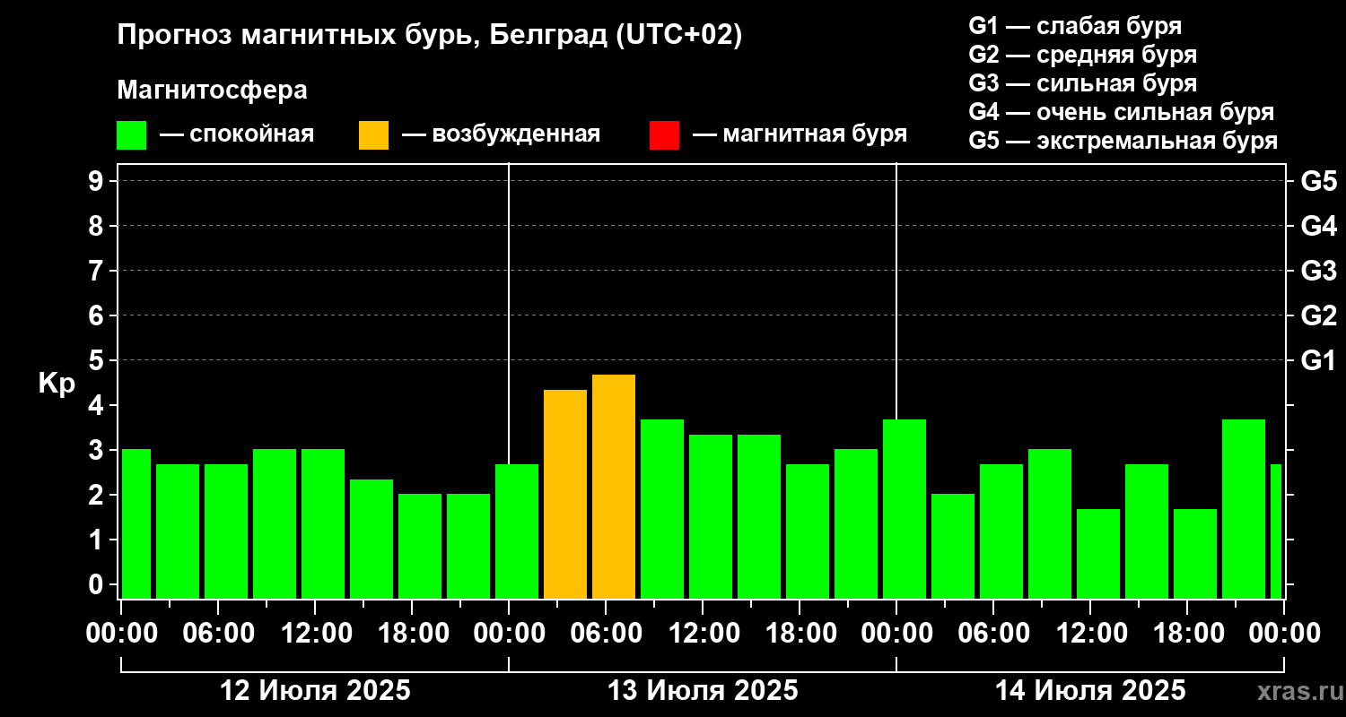Прогноз магнитных бурь в Белграде — 12 июля 2025 года