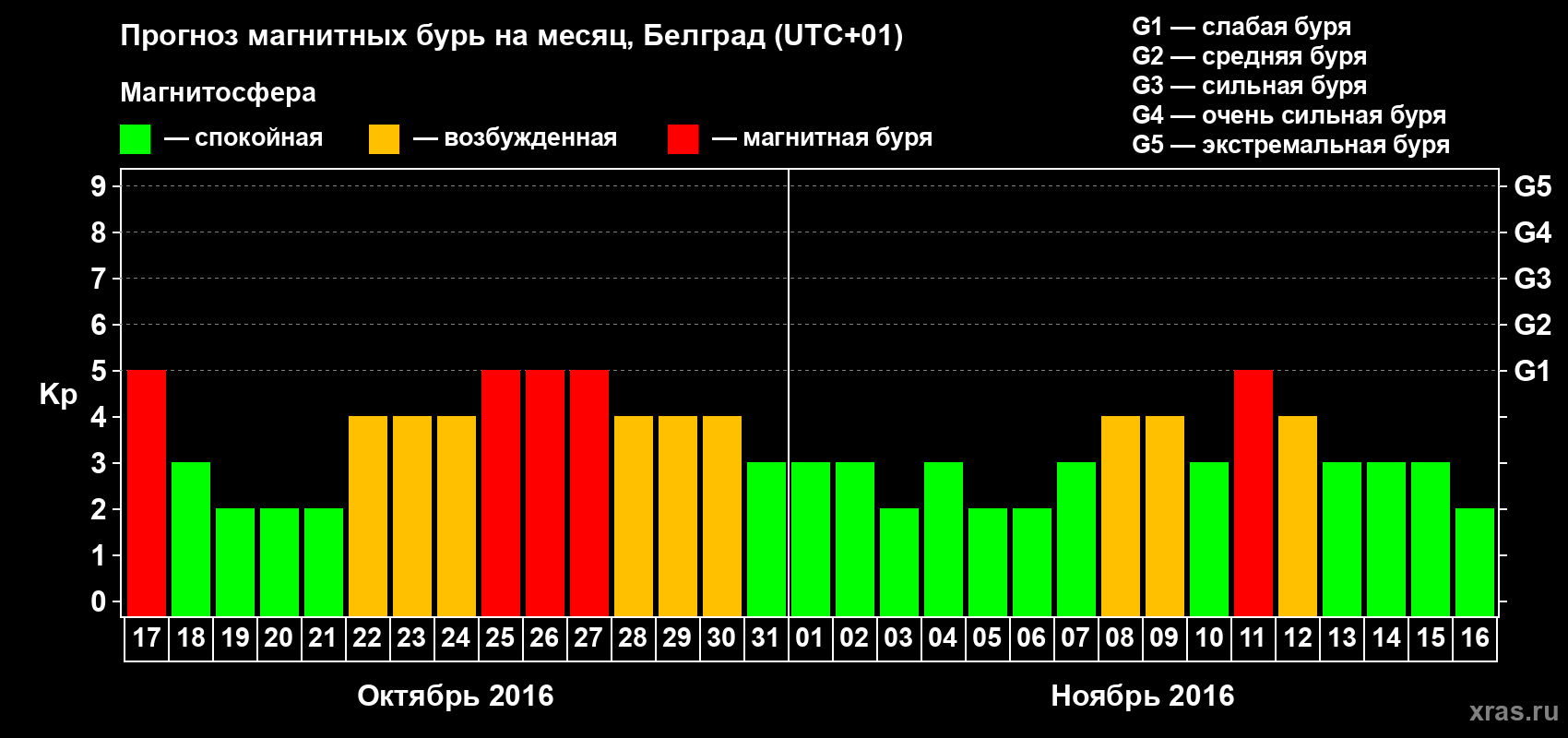 Прогноз магнитных бурь в Белграде — 17 октября 2016 года