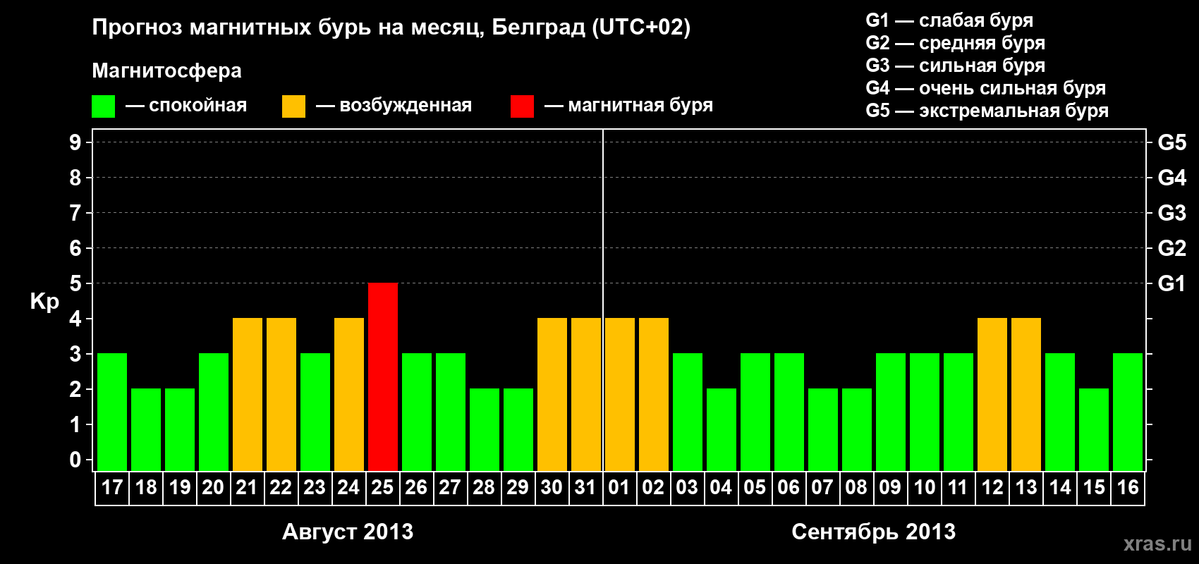 Прогноз магнитных бурь в Белграде — 17 августа 2013 года