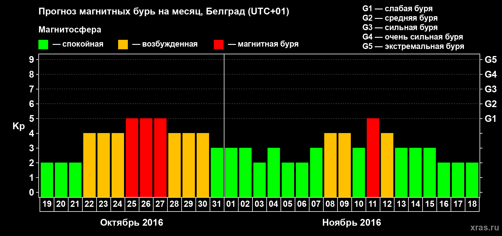 Прогноз магнитных бурь в Белграде — 19 октября 2016 года