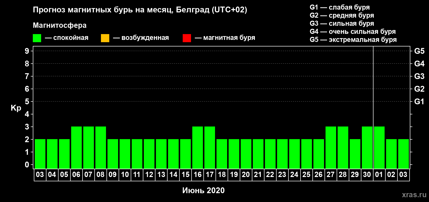 Прогноз магнитных бурь в Белграде — 3 июня 2020 года