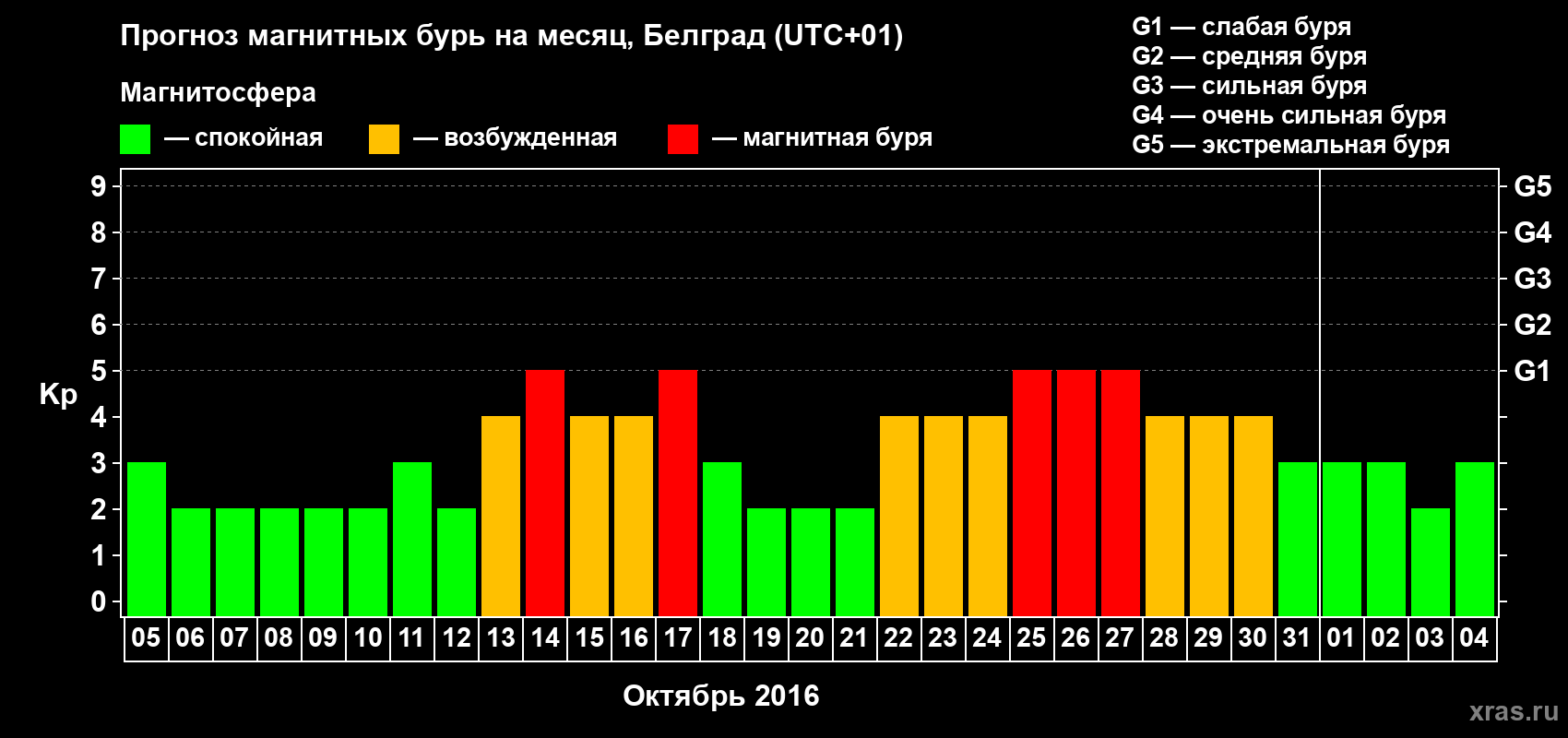 Прогноз магнитных бурь в Белграде — 5 октября 2016 года