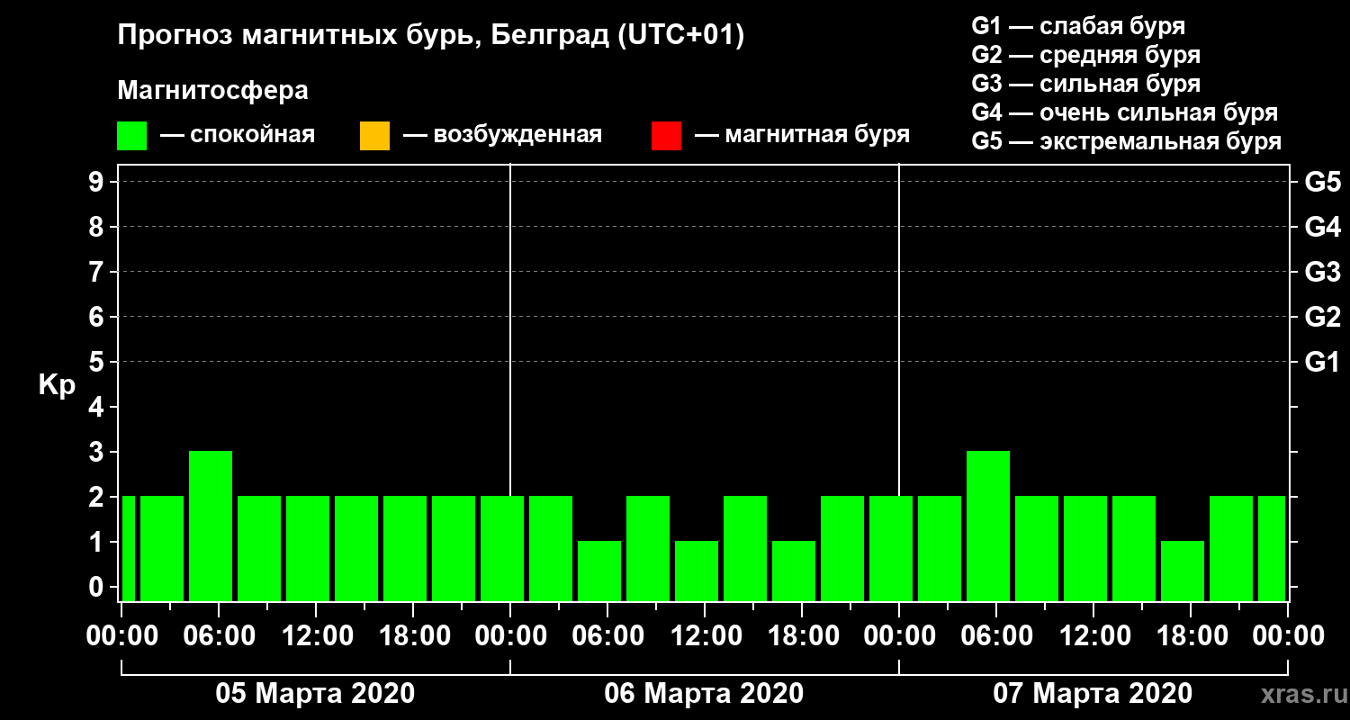 Прогноз магнитных бурь в Белграде — 5 марта 2020 года
