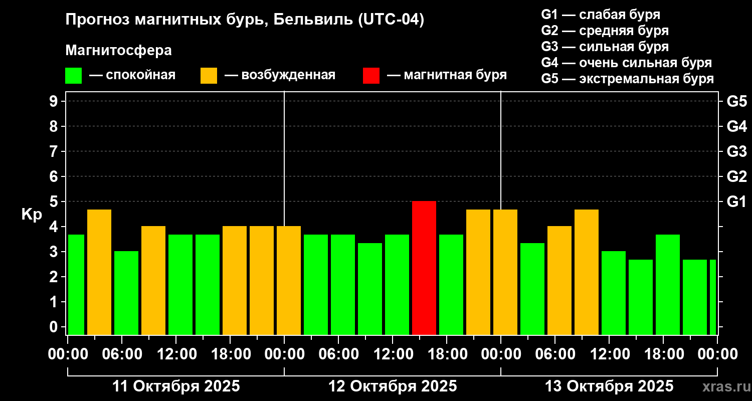 Прогноз магнитных бурь в Бельвиле — 11 октября 2025 года