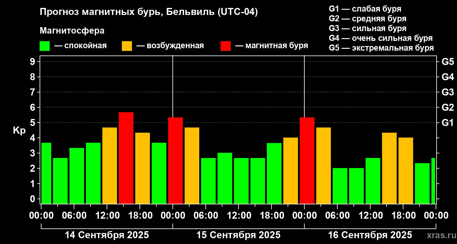 Прогноз магнитных бурь в Бельвиле — 14 сентября 2025 года