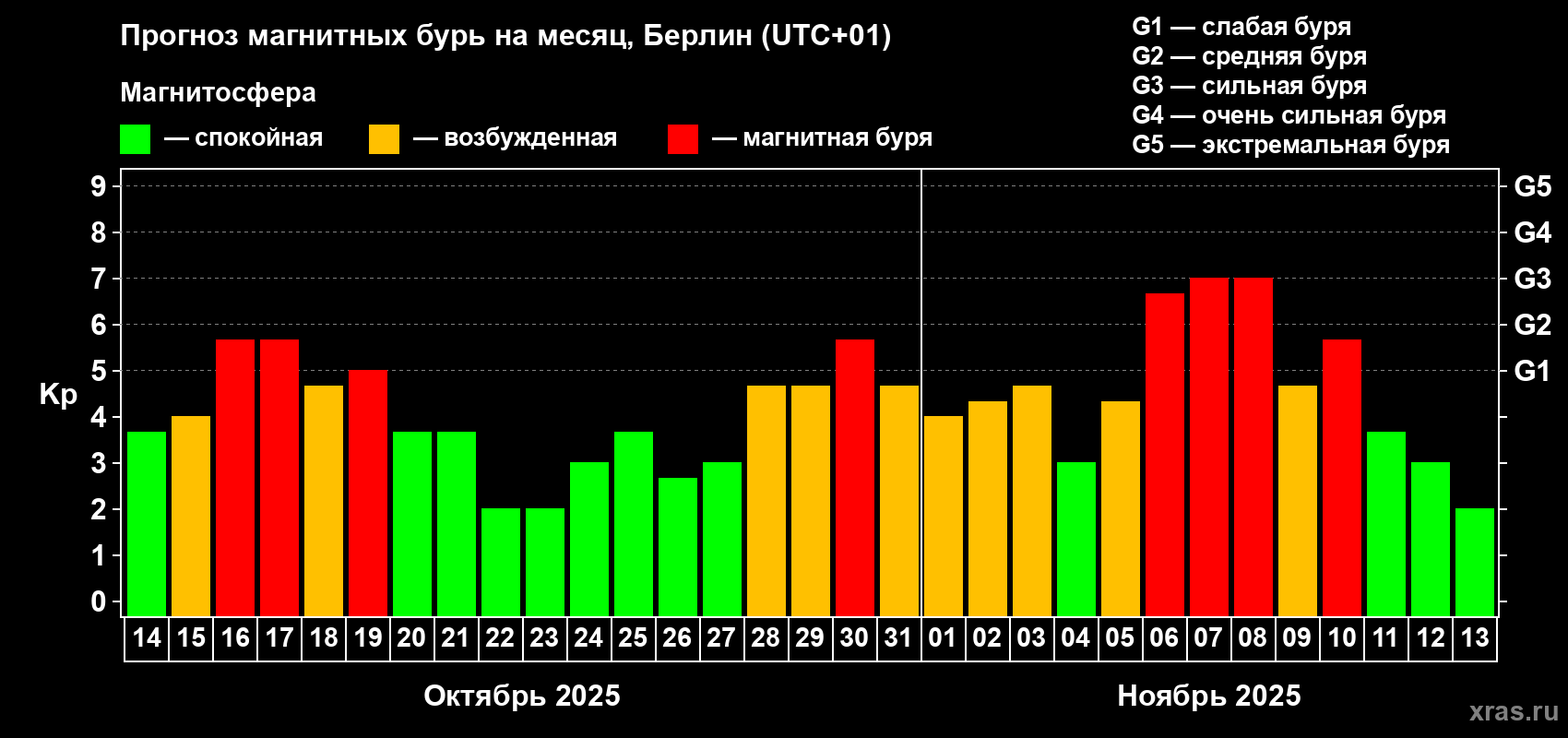 Прогноз магнитных бурь в Берлине на 14 октября 2025 года