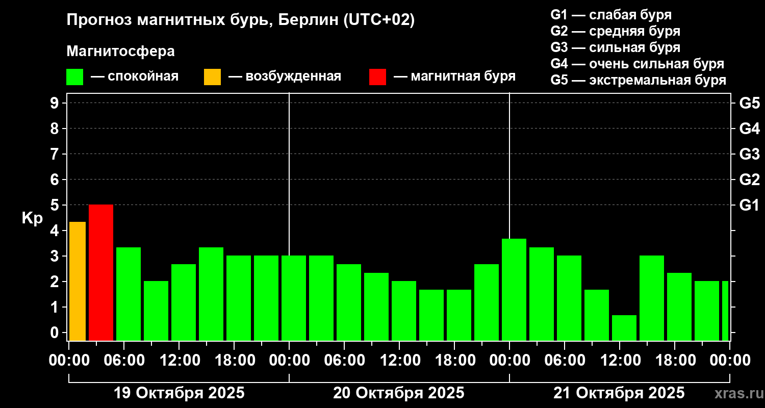 Прогноз магнитных бурь в Берлине — 19 октября 2025 года