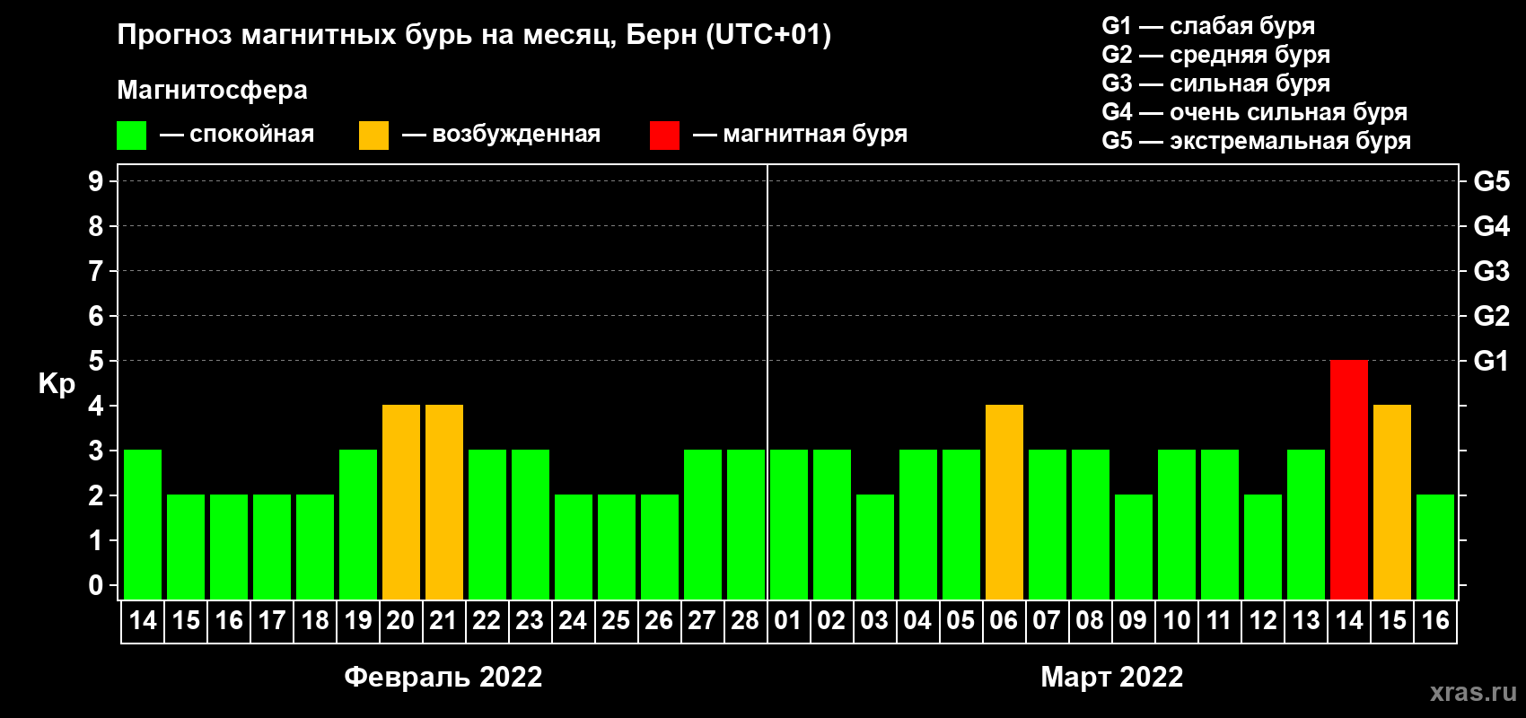 Прогноз магнитных бурь в Берне — 14 февраля 2022 года